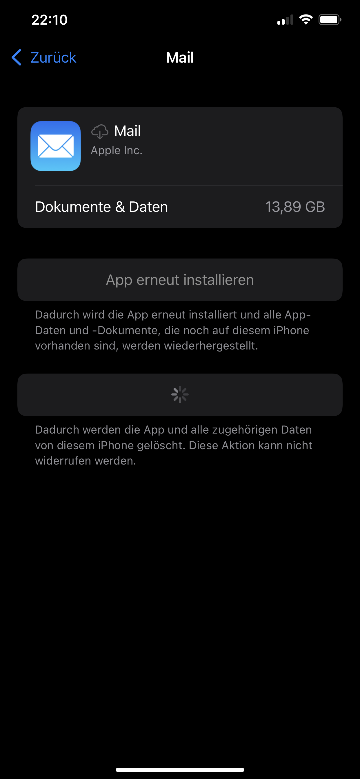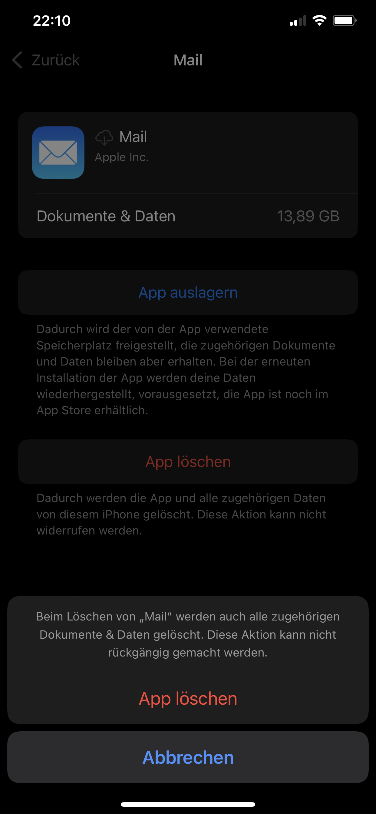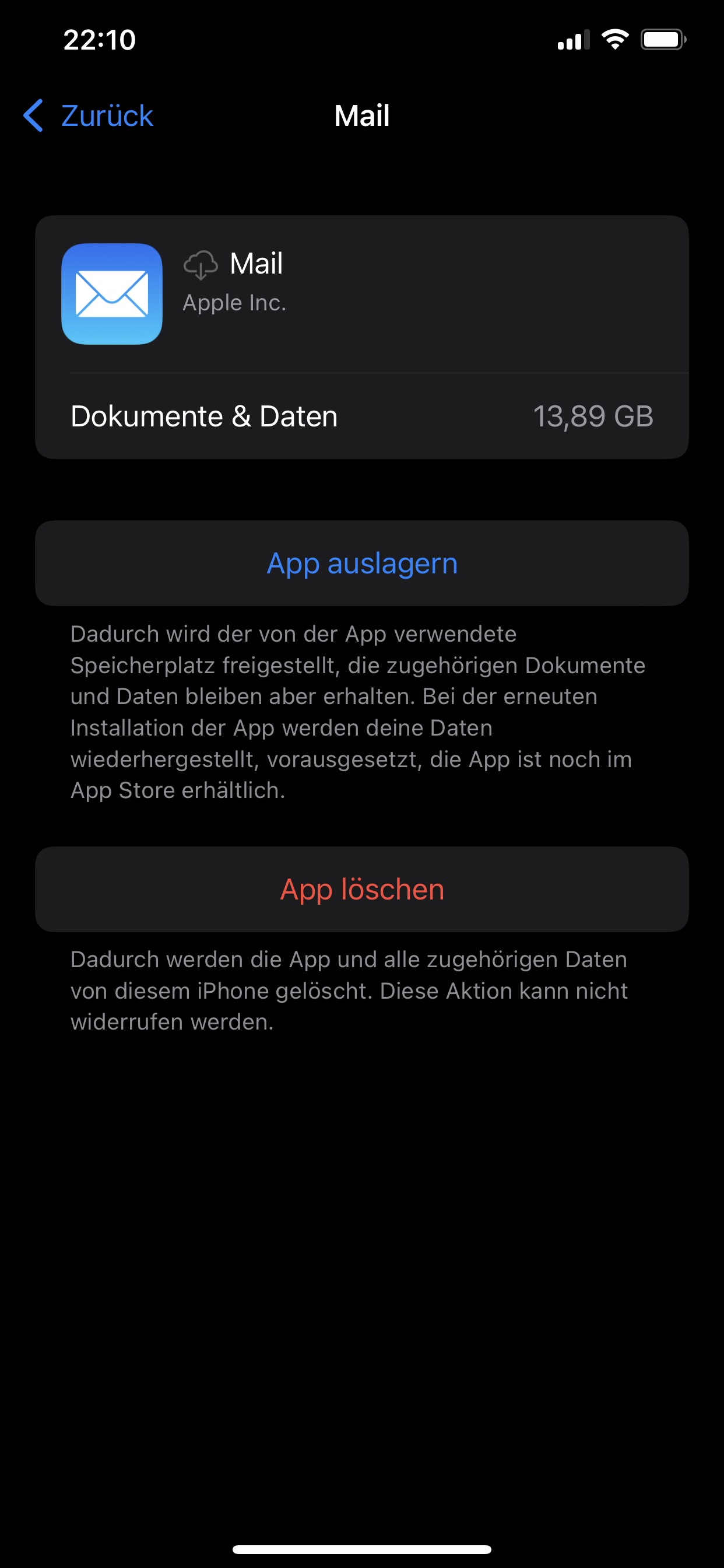 Mail dokumente und daten nehmen mir 13 gigabyte weg ich kann es nicht ändern habe app ausgelagert trotzdem erscheint das es soviel speicher wegnimmt hab versucht zu lös hen und auslagern und alles mögliche