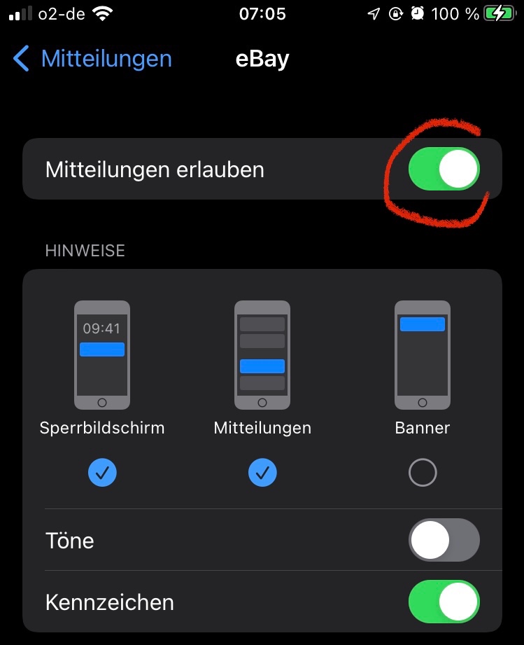 Das geht über Einstellungen—>Mitteilungen—>App auswählen, z.B. Ebay