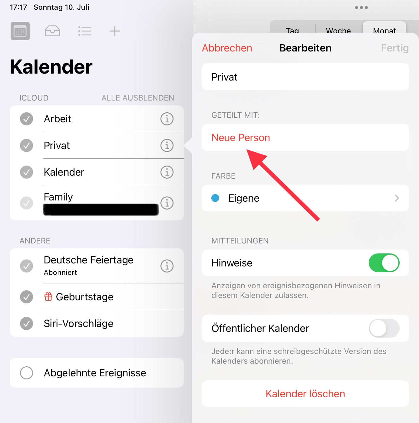 Die Familienfreigabe ist eingerichtet. Allerdings wird der Familienkalender nur mir angezeigt, nicht den Mitgliedern. In der iCloud heißt es "Der Kalender wird automatisch freigegeben". Dies geschieht aber nicht.