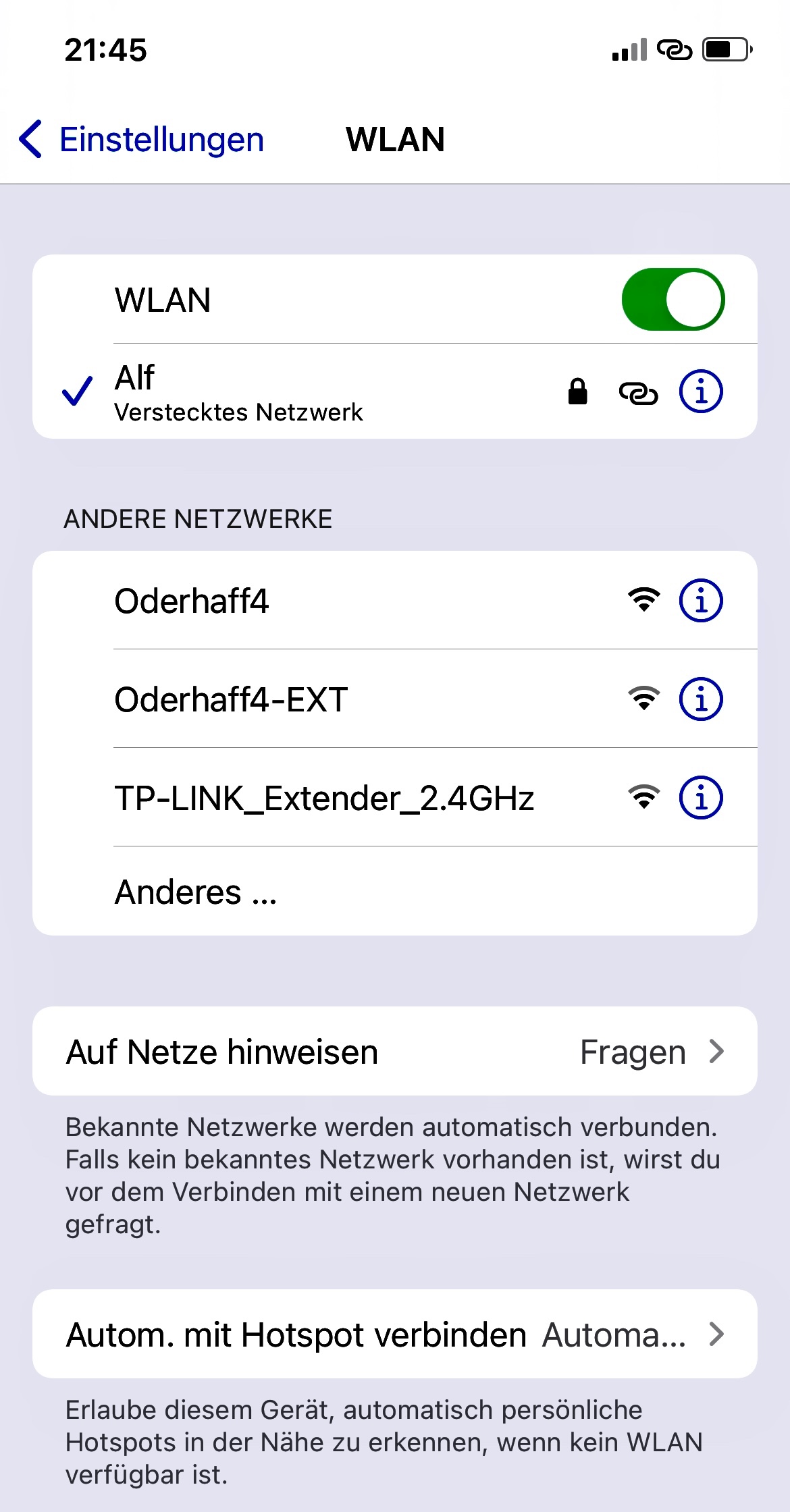 leider hatte ich das schon selbst recherchiert, hat mich aber nicht weitergebracht. Mein Hotspot ist für andere nicht sichtbar. Nur wer den Namen und das Passwort kennt kann ihn finden. Dann steht unter dem Hotspotnamme klein geschrieben „verstecktes Netzwerk „