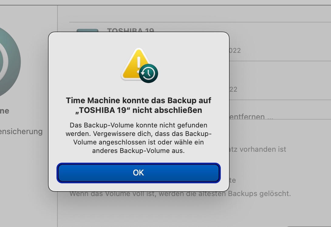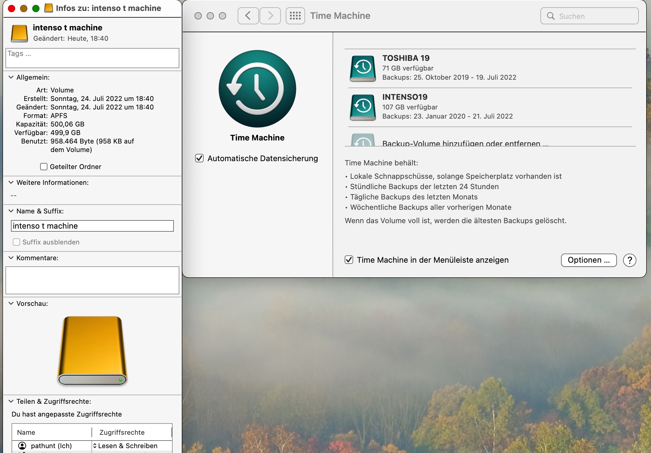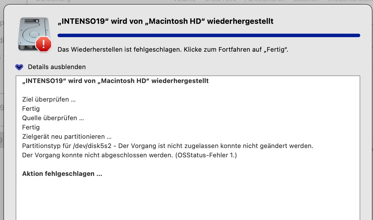 Ich hatte einen Wechsel von mac min 2018 zu m. mini 2020. Vorher 3 externe Festplatten, 2x toshiba, 1x instenso, alle aus 2019 mit USB 3. Meine Dateien (nur rund 160 GB) habe ich mit der intenso importiert mittels Migrationsassistent, alles tutti, Daten sind korrekt auf dem neuen Rechner. Dann die alten Platten (HDD) wieder angedockt; eine toshiba und die intenso an die thunderbolt Buchsen mittels der Adapterkabel. Die zweite toshiba hängt auch direkt an einer USB Buchse, dort habe ich nur manuell Dateien drauf geschoben, hier ist jetzt alles ok. Die anderen beiden machen jetzt Probleme, die wurden vorher für time machine benutzt und sollen es jetzt auch wieder, funktioniert aber nicht richtig. Zuerst gab es nach 2 Tagen Probleme mit der intensio Platte die nicht mehr erkannt wurde, ich habe sie dann über das Festplattendienstprogramm gelöscht (da sie fast voll war) und die Fehlermeldung OSSatus-Fehler 1 erhalten, see pic. Später hatte ich die Platte partitioniert auch damit ging es nicht weiter. Wenn ich jetzt die Platten in time machine öffne kann ich keine manuell anklicken und auf "backup jetzt erstellen" gehen. Ausserdem zeigt es an das beide mit Daten voll sind, was inzwischen nur mit der toshiba 19 der Fall ist, aber nicht mit der intenso, see pics. Weiter steht in time machine nichts davon das die Platten wieder speichern, die Daten sind eindeutig vor meinem Rechnerwechsel. Die Partition für die intenso für time machine heisst "intenso t machine", see pic, ist laut Dienstprogramm eindeutig leer. ....? Ps. die Platten sind nicht schreibgeschützt, ich habe immer Zugriff auf lesen und schreiben....