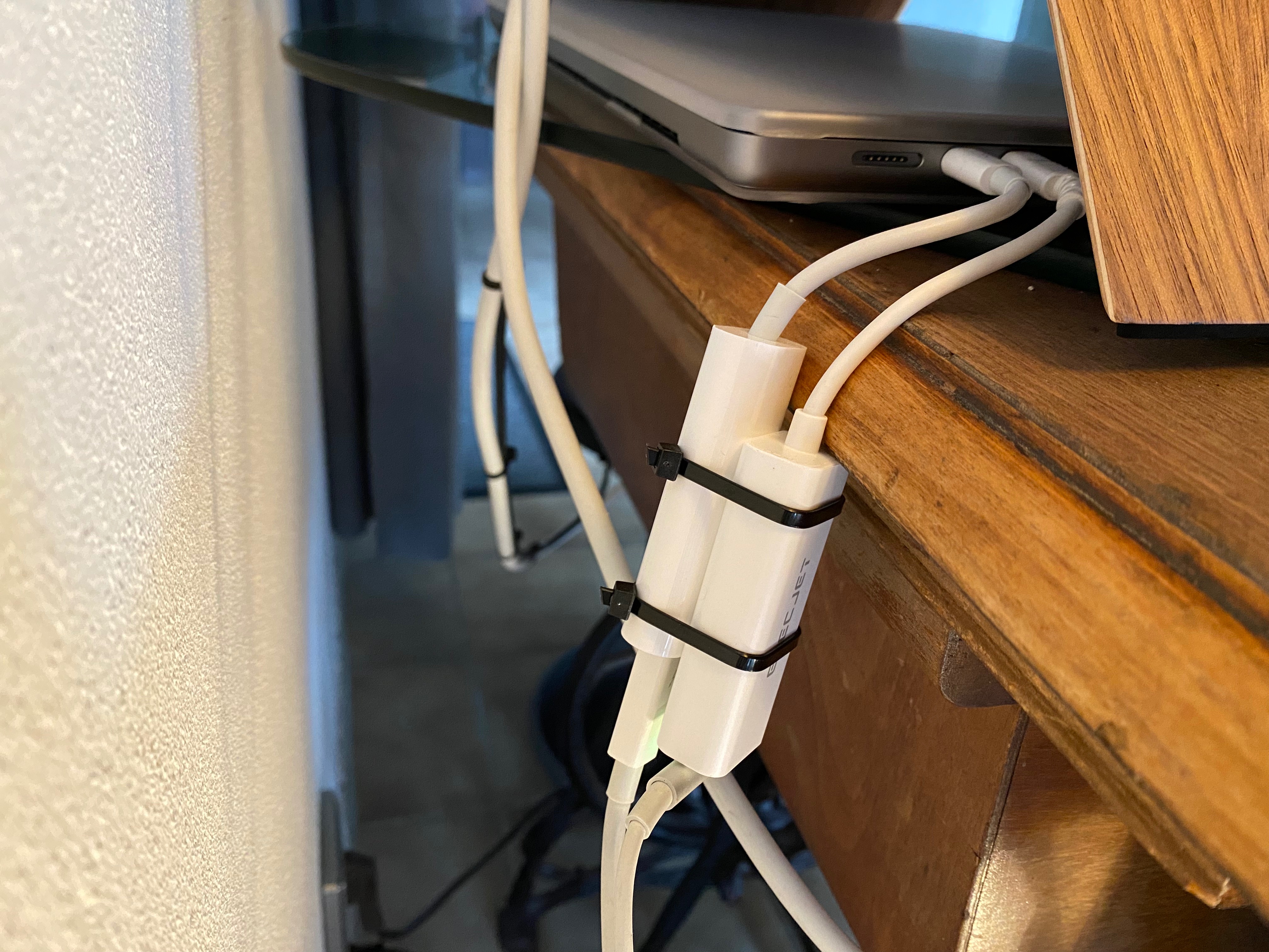 Für Bild, Netzwerk, Audio etc. wird ein Thunderbolt auf USB C verwendet. Für die Stromversorgung ein Magsafe 1 & 2 Adapter auf USB C.