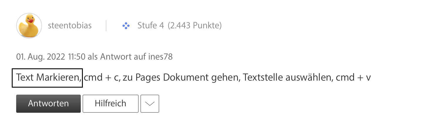 Hallo Tobias, ich habe es wieder versucht und bin am verzweifeln. Der von dir beschriebene Weg funktioniert innerhalb von Pages und innerhalb von Numbers. Es funktioniert komischerweise auch von Pages zu numbers aber eben nicht umgekehrt. Ich habe es über die Tasten, über Multitasking mit Drag&Drop, über die rechte Maustaste ausprobiert. Der Text (Zelleninhalte), auch wenn es markiert ist, wird nicht kopiert. Liegt das an eventuell einer Einstellung? Ich habe bisher nichts finden können.
