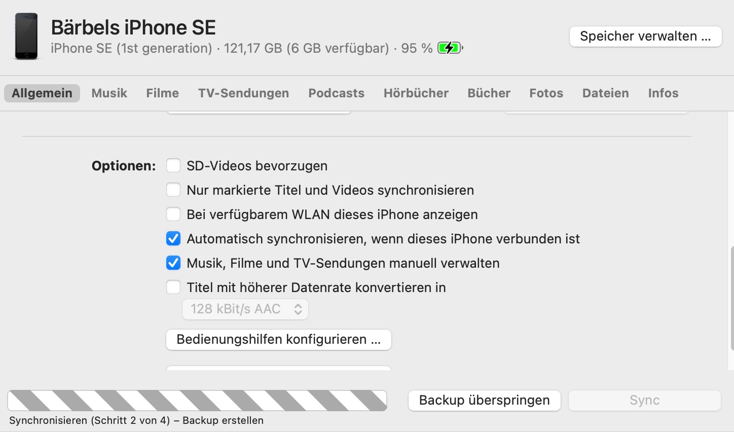 hallo, bei dem letzten Backup meines iPhone SE mit meinem macbook wurde die komplette Musik Mediathek synchronisiert. Obwohl in den Einstellungen "Musik...manuell synchronisieren angewählt war. Jetzt ist der Speicher voll - von 128 GB sind jetzt nur noch 6 Gb verfügbar.