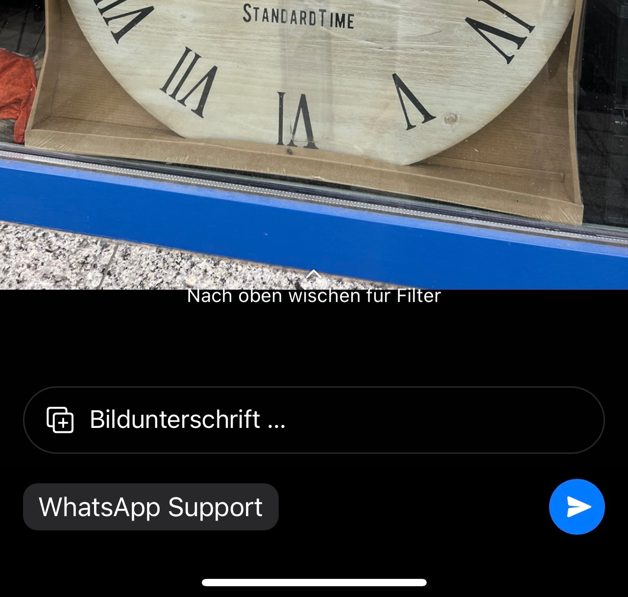 wenn ich auf + drücke dann photos und Medien dann kann ich ein Bild auswählen. Normalerweise ist dann unten links ein + Button wo man dann wieder in die gallate kommt für zusätzliche Bilder zu verschicken. Dieser ist nicht vorhanden und stattdessen steht da der Name an den ich das Bild sende der normalerweise unten rechts stehen sollte.