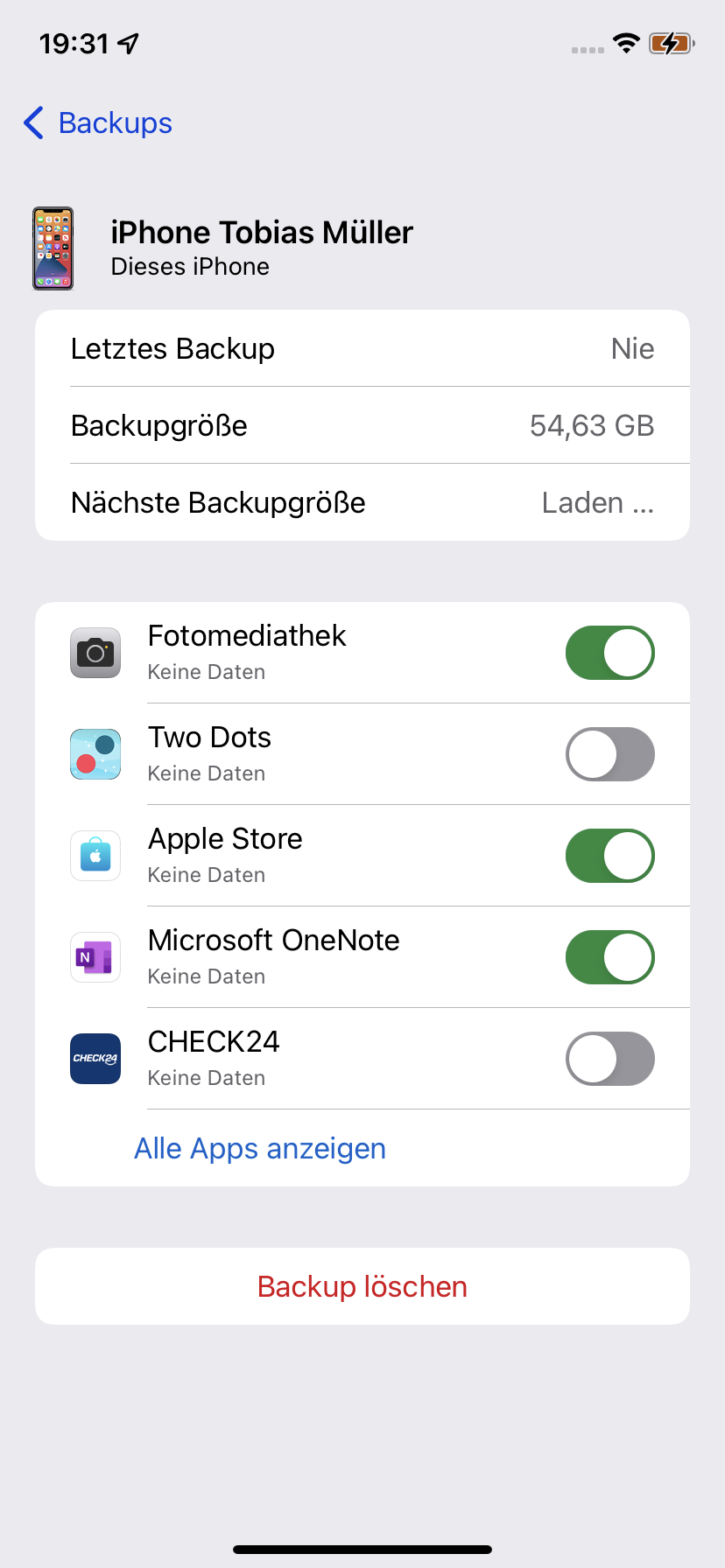 Bei meinem Backup erscheint unter Datum „letztes Backup“ das Wort „nie“ statt einem Datum obwohl volle 56GB angezeigt werden. Backup Kamm auf neuem iPhone micvtvteudbek werden „kein Backup vorhanden“ . Woran könnte es liegen ??