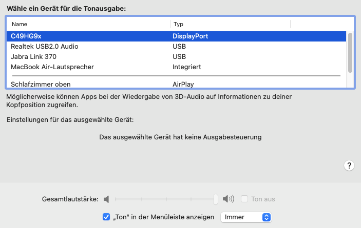 seit dem ich mein MBA besitze hat es noch nie mit der Audio-Ausgabe über das DisplayPort geklappt. Mein Monitor (Samsung C49HG9DMU) schaltet sich auch nur ein, wenn ich das DisaplyPort an der Docking Station (Dell WD15) abziehe und dann wieder anstecke. Das Problem haben anscheinend mehrere Leute, wie ich nach kurzer Recherche feststellen konnte.