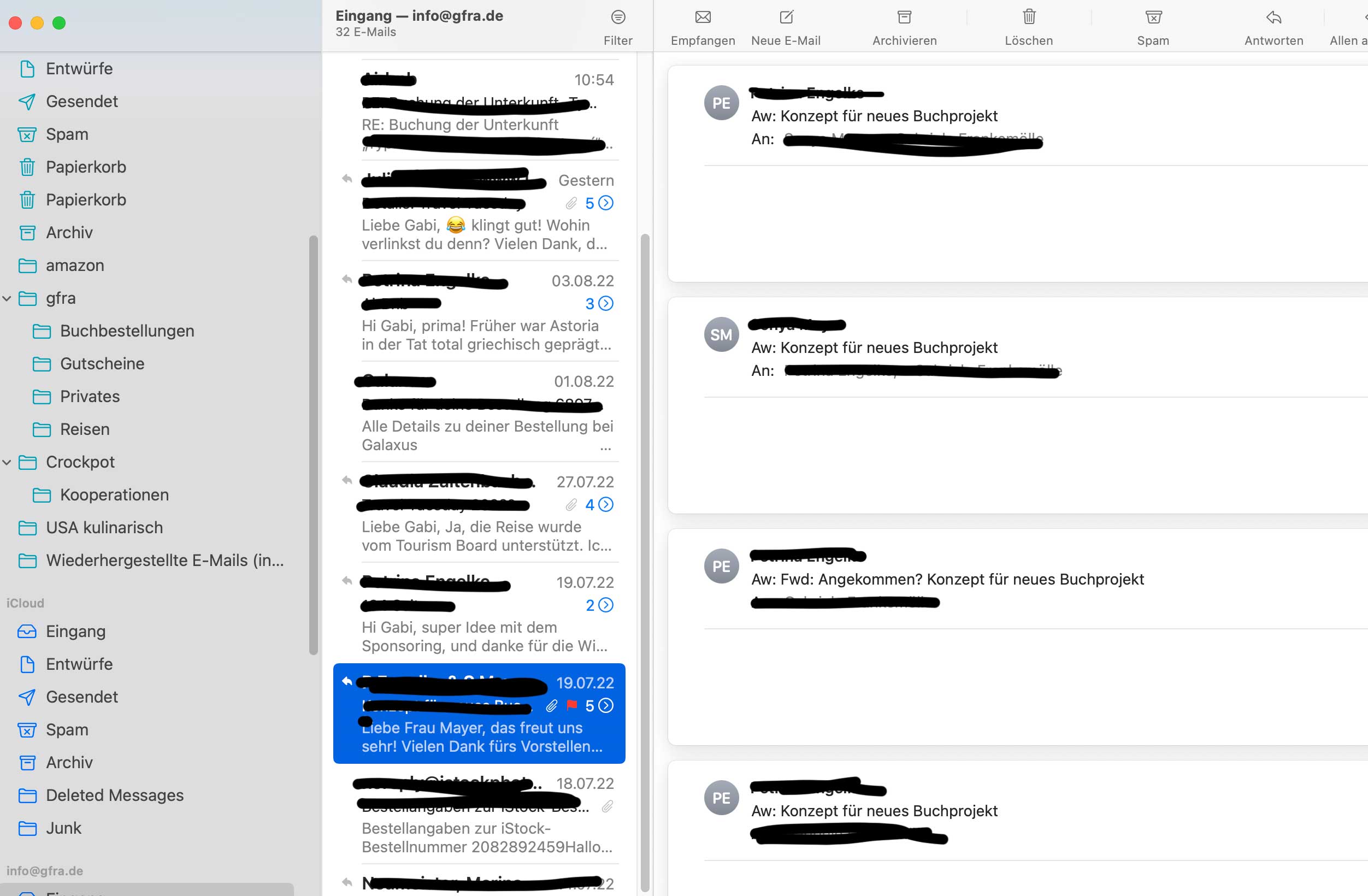 Hallo allerseits - ich nutze einen iMac mit macOS Monterey (12.5), Probleme bereitet mir das Mailprogramm (v16). Die empfangenen Mails werden mir neuerdings lange (einige Minuten) nicht mehr im Vorschaufenster angezeigt, obwohl ich die Vorschau aktiviert habe (siehe Screenshot). Den Anfang der Mails kann ich noch der 2. Spalte v.l. entnehmen - aber der volle Inhalt erscheint rechts erst nach langer Wartezeit.