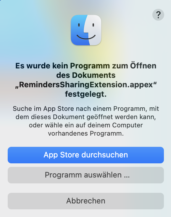 <<< Es wurde kein Programm zum Öffnen des Dokuments „RemindersSharingExtension.appex“ festgelegt. >>>