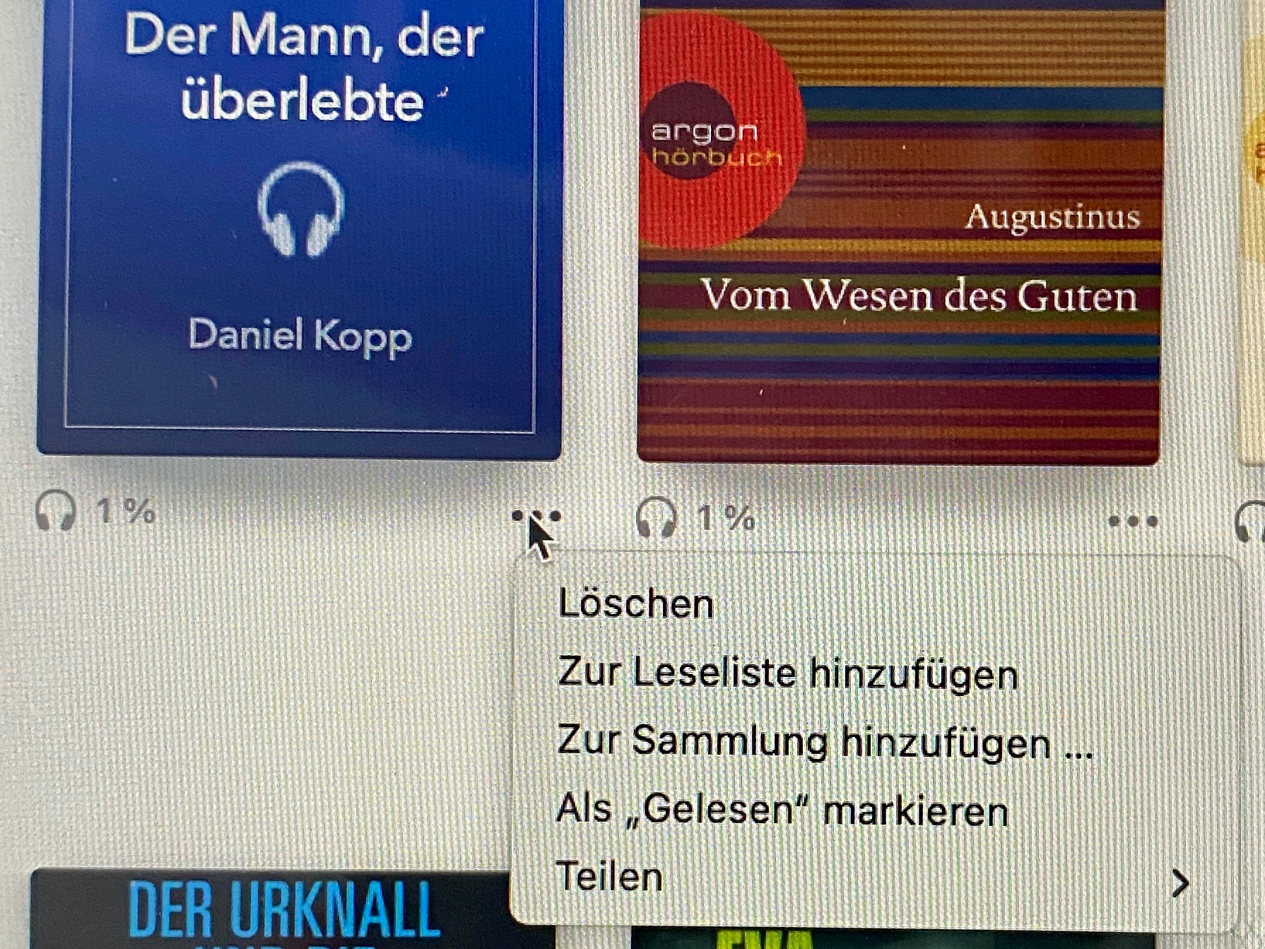 - Welche Schritte hast du bereits selbst ausprobiert?: Ich habe auf das 3-Punkt-Menü des Hörbuches geklickt und dort die Auswahl bekommen, die ich im beigefügten Bild gesehen habe.