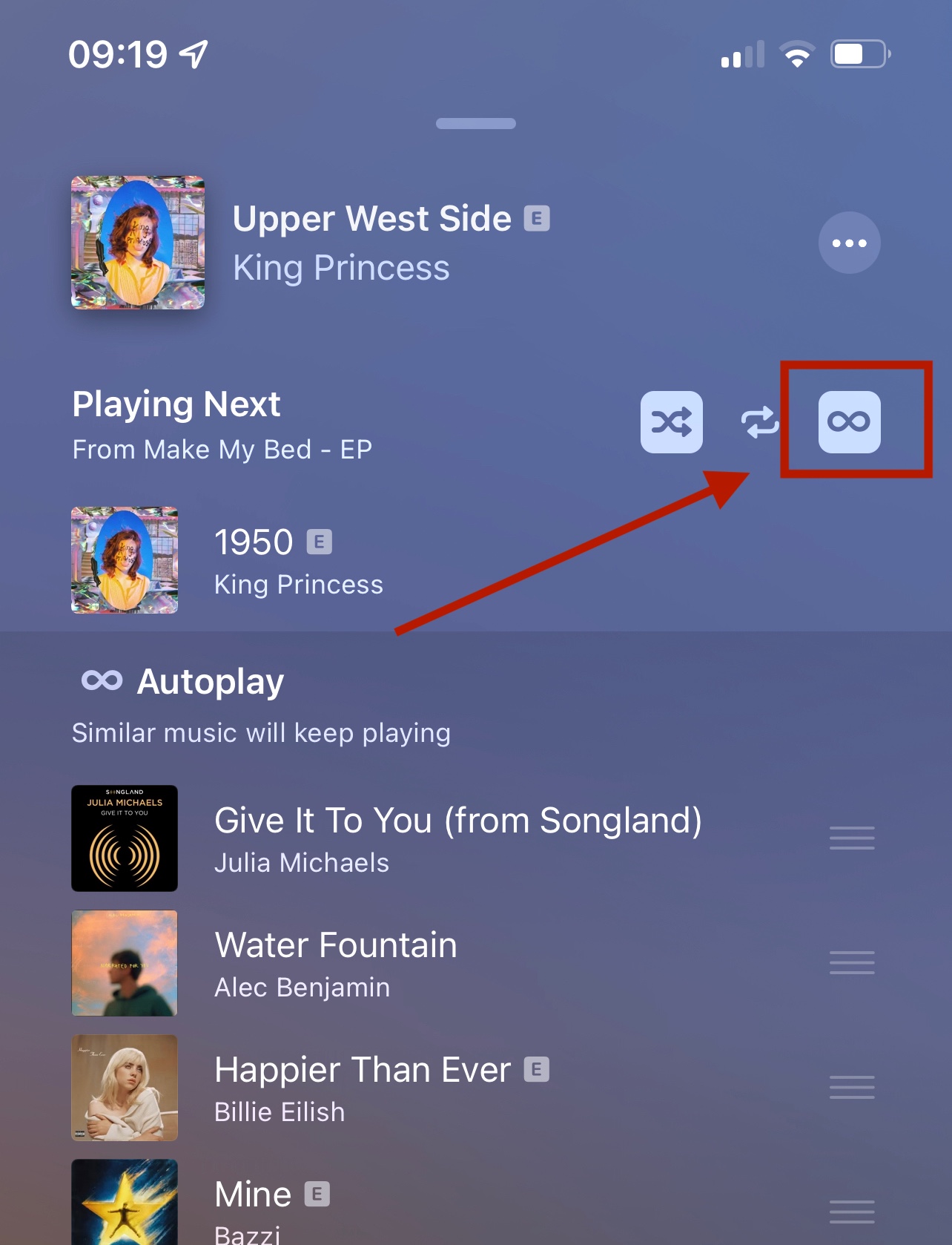 Dies ist die Autoplay Funktion, welches automatisch ähnliche Musik spielt wenn die von dir gewählte Musik fertig gespielt ist. Um dies auszuschalten musst du hier auf das ∞ klicken.