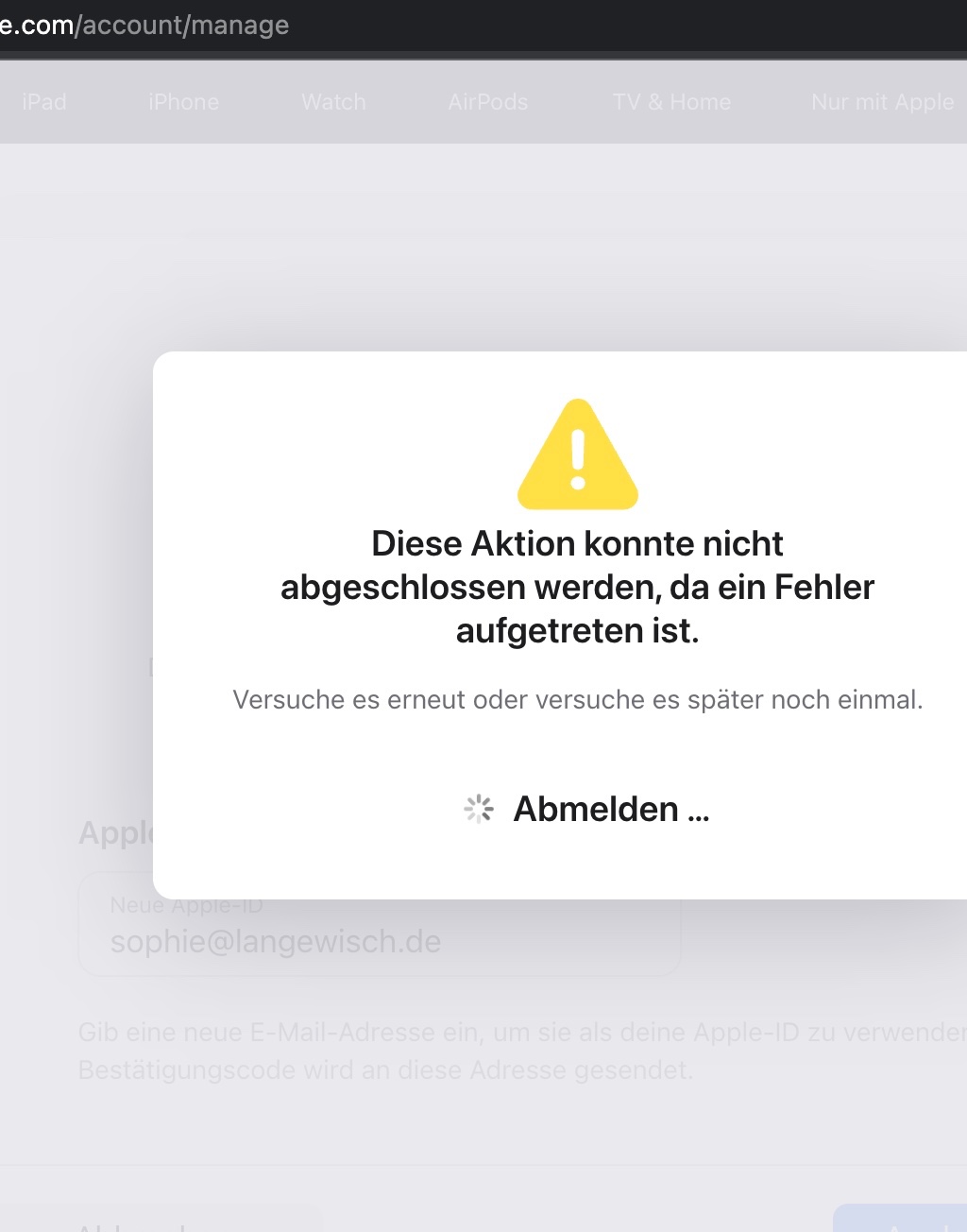 Neue eMail kann eingetragen und bestätigt werden, jedoch bricht das Portal von Apple mit einer Fehlermeldung ab.