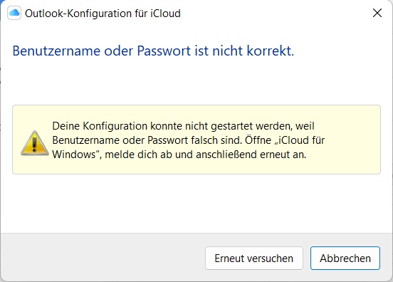 "Outlook-Konfiguration für iCloud: Benutzername oder Passwort ist nicht korrekt. Deine Konfiguration konnte nicht gestartet werden, weil Benutzername oder Passwort falsch sind. Öffne "iCloud für Windows", melde dich ab und anschließend erneut an."