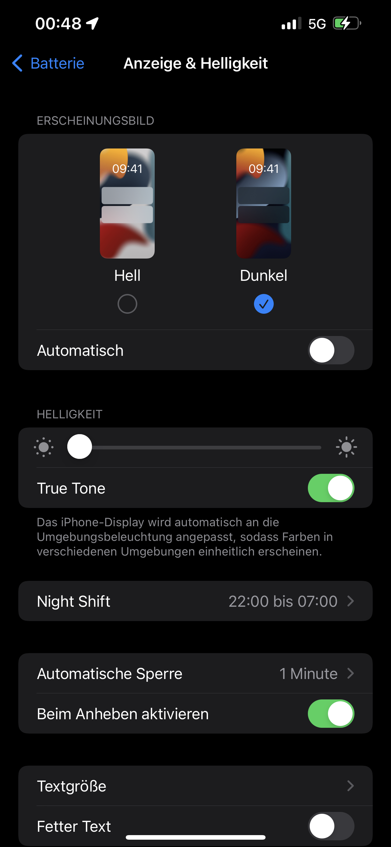 Hohe Helligkeit unter Batterie auf iPhone 13 trotz dunkler Einstellung des Bildschirms