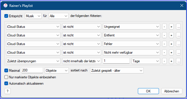 ich habe unter iTunes eine intelligente Playlist erstellt, die mir meine 200 am längsten nicht gespielten Titel zur Verfügung stellt.