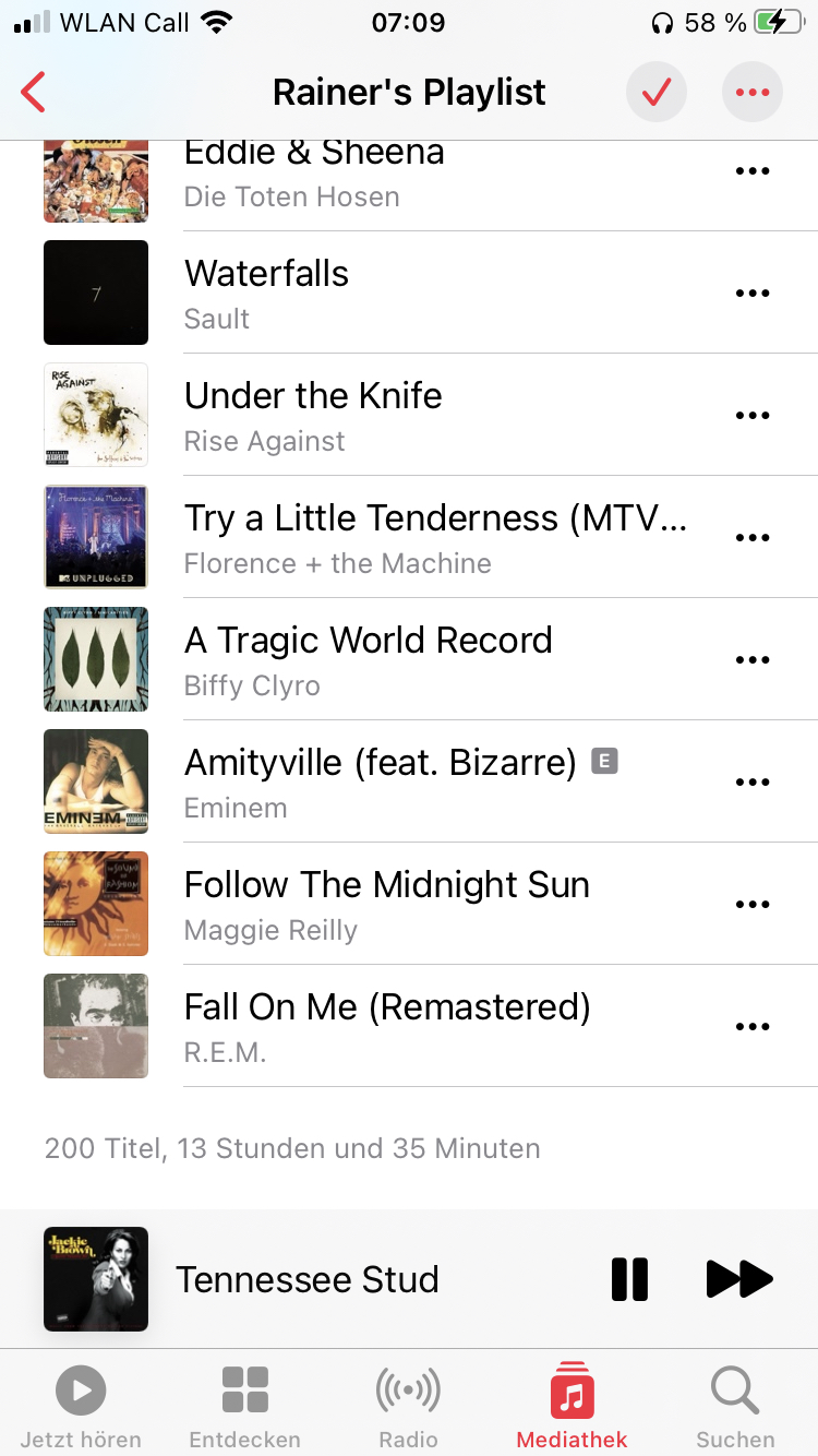 Soweit so gut, was mich allerdings etwas nervt, ist die Tatsache, dass nach einer gewissen Zeit keine Titel mehr geladen werden. Das ist egal solange man man eine Mobilfunkverbindung hat. Ist man allerdings mit dem Auto unterwegs oder im Pfälzer-Wald beim Wandern, hat kein Netz und möchte Musik hören, gibt es ein Problem - das iPhone spielt keine Musik mehr!