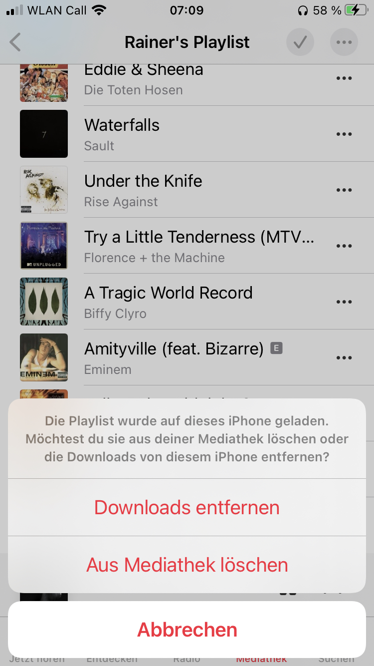 Ich kann dieses Problem umgehen, indem ich alle paar Tage, unter Allgemein/iPhone-Speicher/Musik/Alle Titel lösche. Ab diesem Zeitpunkt wird die Musik wird korrekt heruntergeladen und alles ist gut. Das geht solang gut, bis die geladene Musik anscheinend eine gewissen Größe erreicht hat.