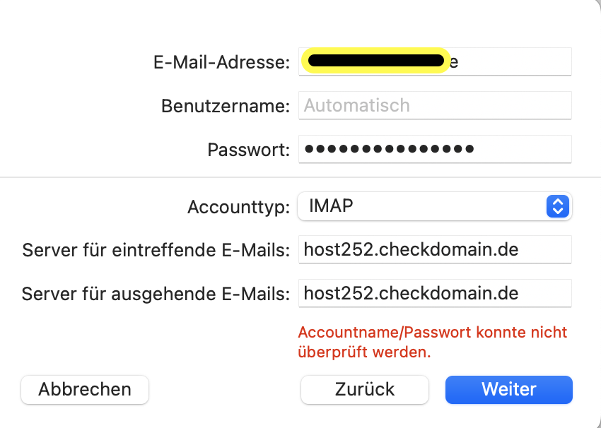 Auf der Webmail-Oberfläche des Anbieters kann ich mich mit ebendiesen Daten problemlos einloggen, aber beim Einrichten von Apple Mail erhalte ich immer eine Fehlermeldung.