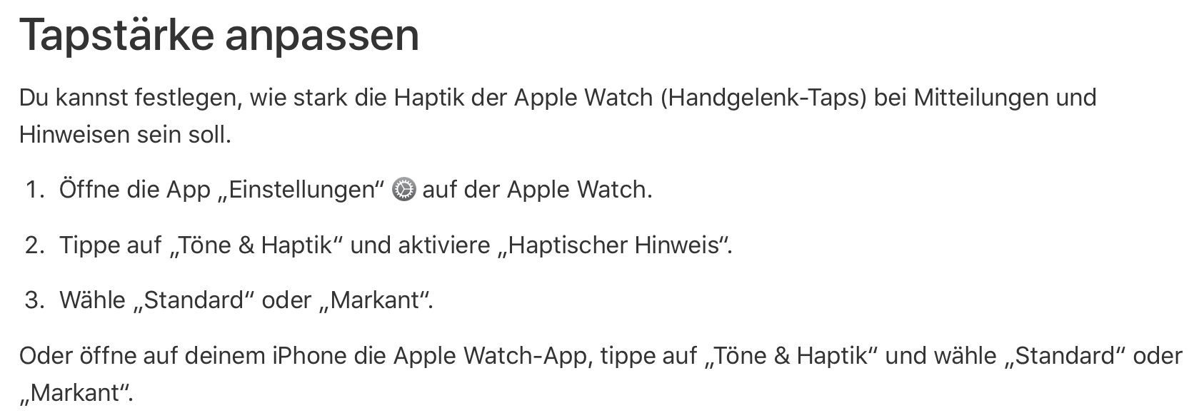 Information aus: Anpassen von Helligkeit, Textgröße, Tönen und Haptik auf der Apple Watch