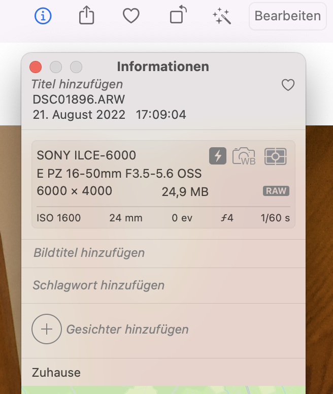 Hi, eine Frage, ich habe die letzten Urlaubsbilder Bilder von meiner Sony Alpha 6400 auf die Fotos App von meinem iMac gespielt (Raw- Dateien). Es dauert ziemlich lange bis die Bilder laden doch nach etwa 3 Sekunden werden sie meistens scharf angezeigt. Wenn ich eines dieser Bilder jedoch in der Foto App etwas bearbeite, also zB die Farben verändere oder ähnliches, dann auf ,,fertig" drücke und auf ein anderes Bild klicke und wieder zu dem bearbeitetem Bild zurückgehe, dann ist dieses sehr unscharf und lädt auch nicht. Wenn ich dieses Bild dann exportieren möchte, kommt außerdem die Meldung "unbekannter Fehler". Weiß einer von euch vielleicht woran das liegen könnte? Ich lade meine Kamerafotos schon ziemlich lange in die Fotos App hoch, doch diese Meldung kommt erst seit paar Monaten. Wichtig ist vielleicht noch zu erwähnen, dass die Bilder gleichzeitig auch in der iCloud hochgeladen werden. Danke schonmal!