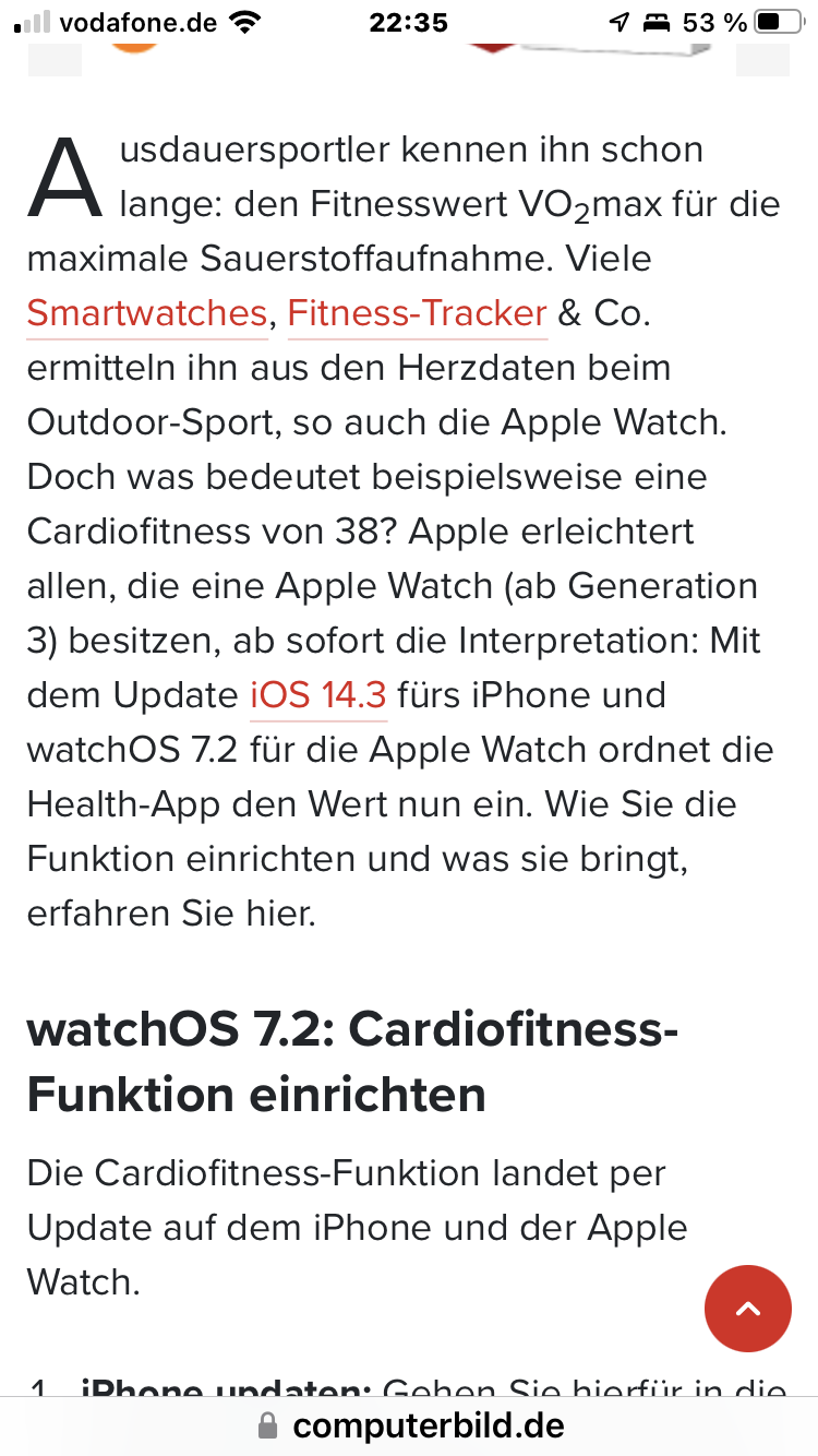 ich kann auch nicht Hohe- & niedrige Herzfrequenz-Mitteilung abrufen! Wenn ich wie auf der Supportseite beschrieben erst auf dem IPhone in der Health App auf „Herz“ gehe, dann auf „Entdecken“ und weiter auf „Cardiofitness“ erscheint nicht, wie in der Anleitung beschrieben, der Punkt „Konfigurieren“! Kann diesen also auch nicht anklicken um das ganze abzuschließen.