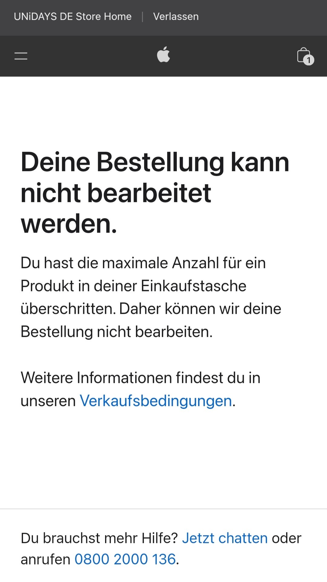 "Du hast die maximale Anzahl für ein Produkt in deiner Einkaufstasche überschritten. Daher können wir deine Bestellung nicht bearbeiten"