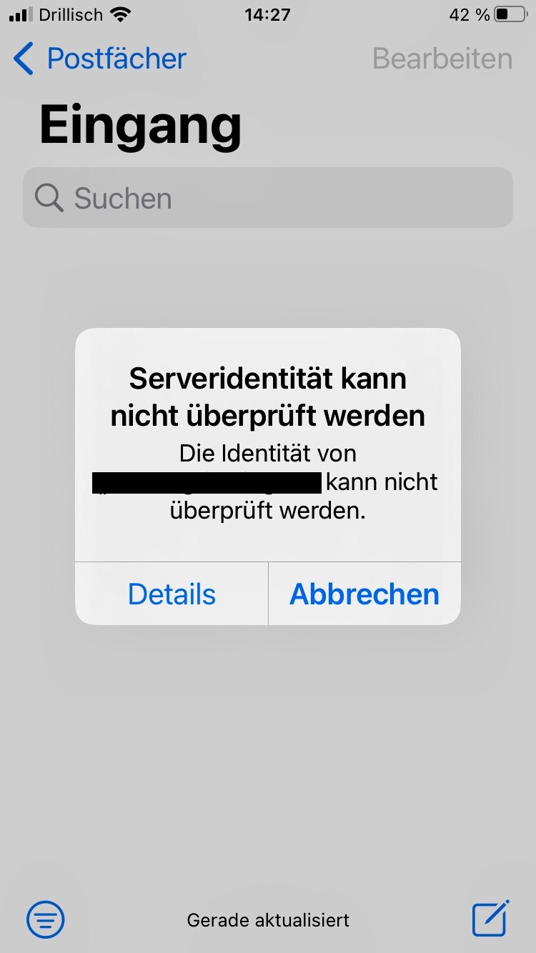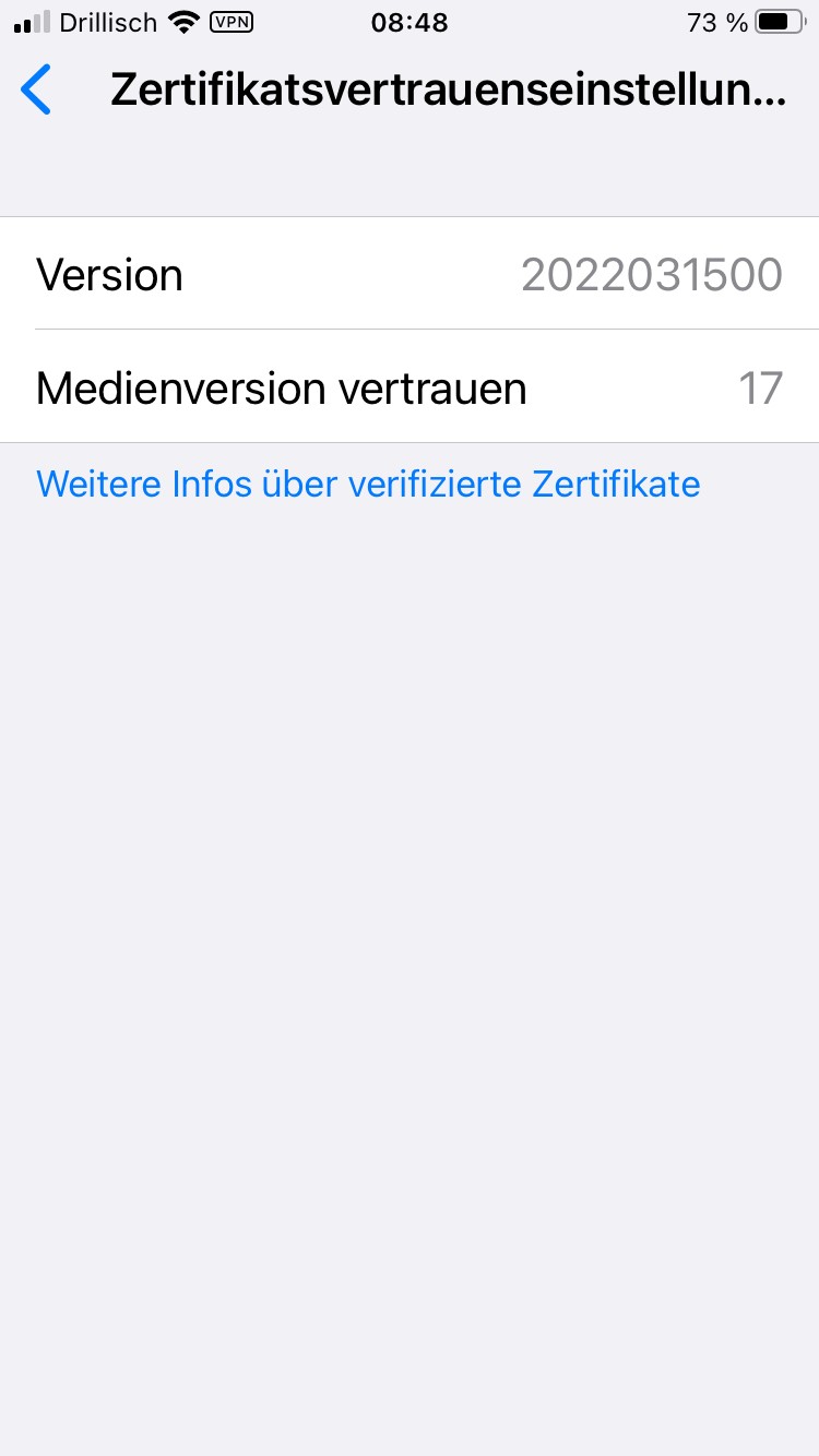Ich habe schon 2 private Mailkonten eingerichtet (gmail und freenet) und beide funktionieren einwandfrei. Zusätzlich sollte noch der berufliche Mailaccount eingerichtet werden (David Tobit) und dabei gibt es Probleme, da David wohl ein selbstdefiniertes Mailzertifikat benötigt. Der Server, Mailadreese, Passwort lassen sich alle eingeben. Aber dann kommt die Fehlermeldung "Serveridentiät kann nicht überprüft werden" (siehe unten). Unter Einstellungen/Allgemein/Info/Zertifikatseinstellungen wird bei mir (nutze IOS 15.6.1) der Punkt "Volles Vertrauen in Root Zertifikate" gar nicht mehr angezeigt, siehe unten. Ich hatte schon mal beim Apple Support nachgefragt, das ist wohl seit einem Upadate nicht mehr verfügbar. Das Problem scheint wohl zu sein, dass das Iphone für die Verbindung zum David Server ein Zertifikat benötigt. Vom Apple Support hatte ich schon die Antwort erhalten "Apple empfiehlt die Bereitstellung von Zertifikaten über den Apple Configurator oder die Mobilgeräteverwaltung. Zertifikat-Payloads, die mit dem Configurator, MDM oder als Teil eines MDM-Registrierungsprofils installiert wurden, vertrauen SSL automatisch." Da fehlt mir aber leider das Verständnis für. Ich bin Umsteiger von Android auf IPhone. Bei Android konnte der Mailzugang für meinen Arbeitsaccount über David Tobit ganz normal in die gmail App eingebunden werden. Bei meinem IPhone funktioniert das bisher leider weder über die gmail App noch über die Apple Mail App.