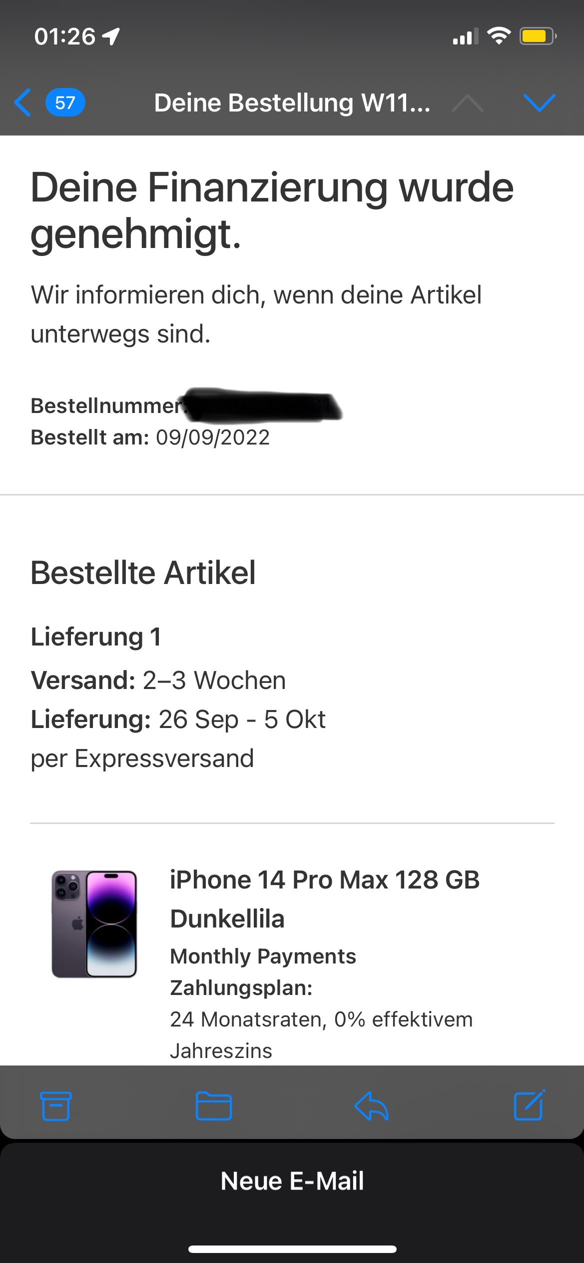 Bestätigungsmail zur iPhone 14 Finanzierung