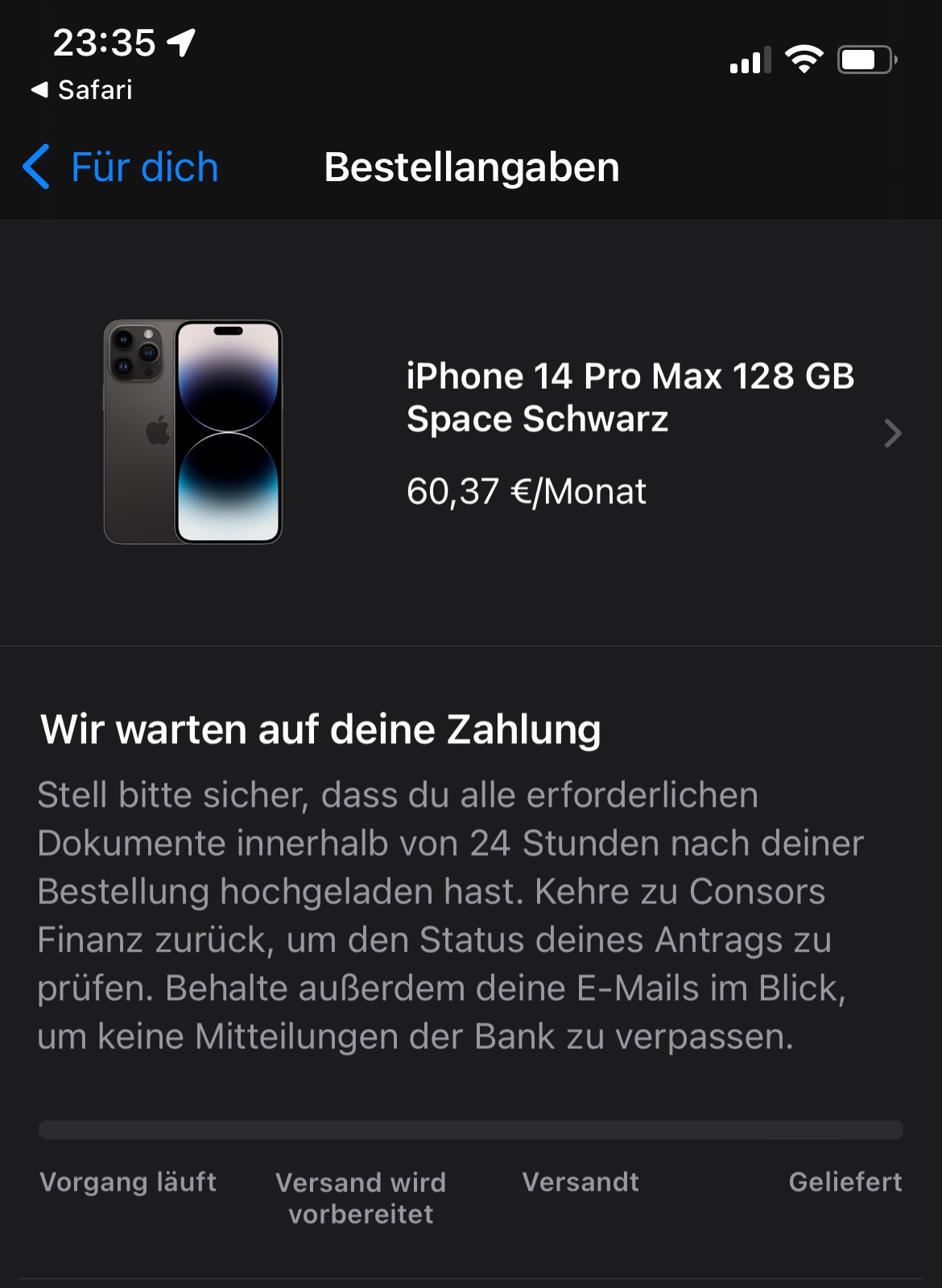 Ich habe eben bei Apple angerufen, dort hieß es die Finanzierung wäre abgelehnt worden. Ich habe aber den genehmigten & unterschriebenen Kreditvertrag hier vor mir. Apple kann an dieser Stelle nicht weiterhelfen, ich soll die Consors Finanz anrufen. Laut Consors Finanz wurde mein Antrag abgelehnt aufgrund eines technischen Fehlers. Ich soll neu anfragen. Ganz ganz großes Kino von Apple und Consors Finanz. Das war's für mich erstmal mit dem Thema.