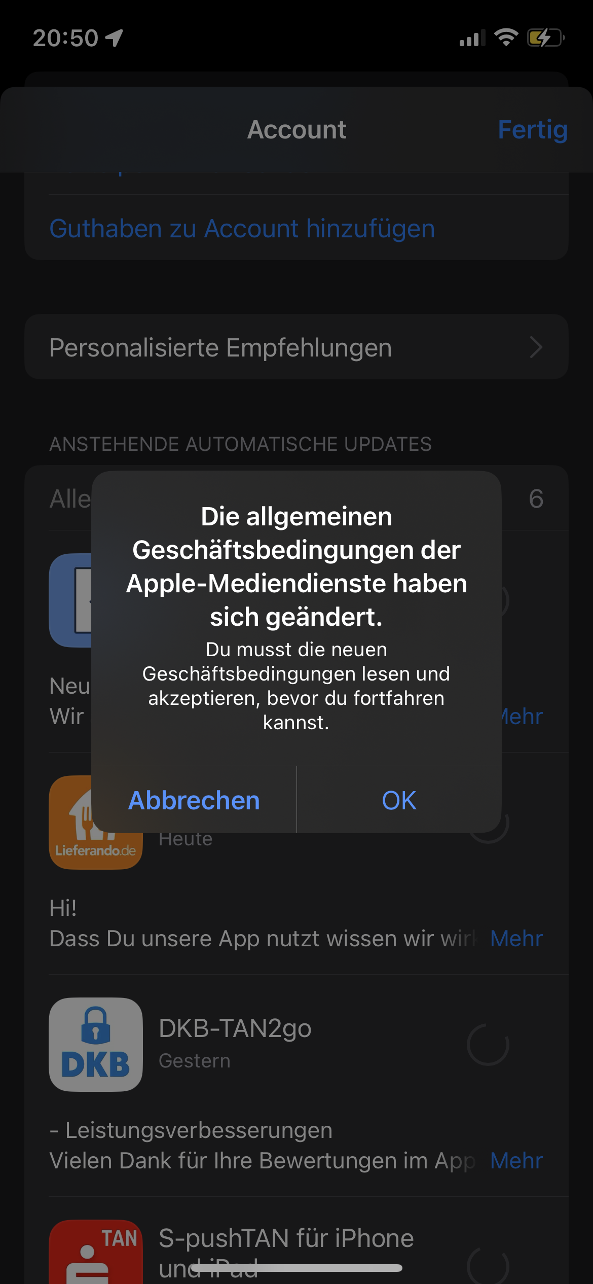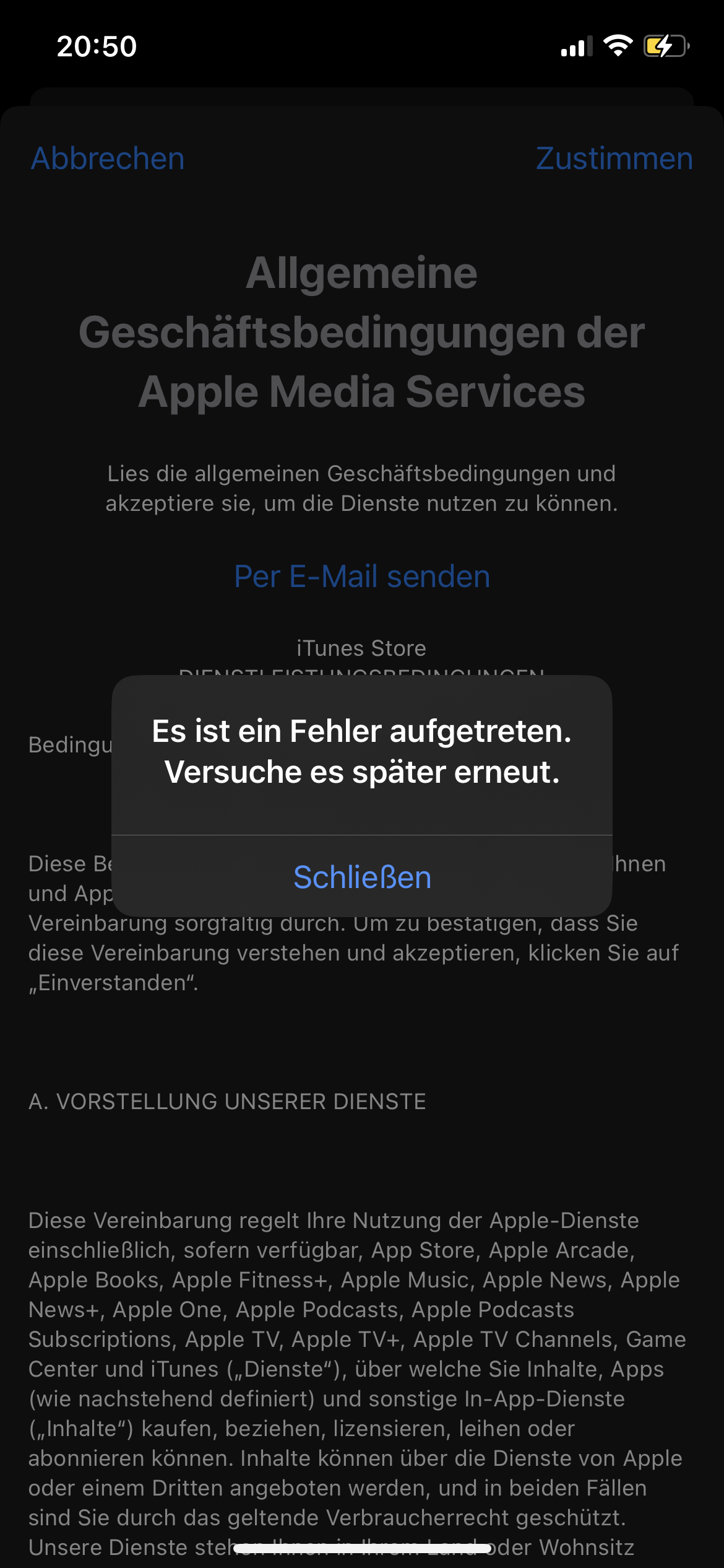 Nachdem ich mein iPhone auf iOS 16 Geupdated habe und versuchte, im App Store eine App zu aktualisieren, bekam ich die Meldung, dass Apple seine Geschäftsbedingungen erneuert hat beziehungsweise geändert hat. Diese soll man jetzt annehmen und sich durchlesen als ich auf annehmen klickte stand dort „Es ist ein Fehler aufgetreten. Versuchen Sie es später noch mal.“