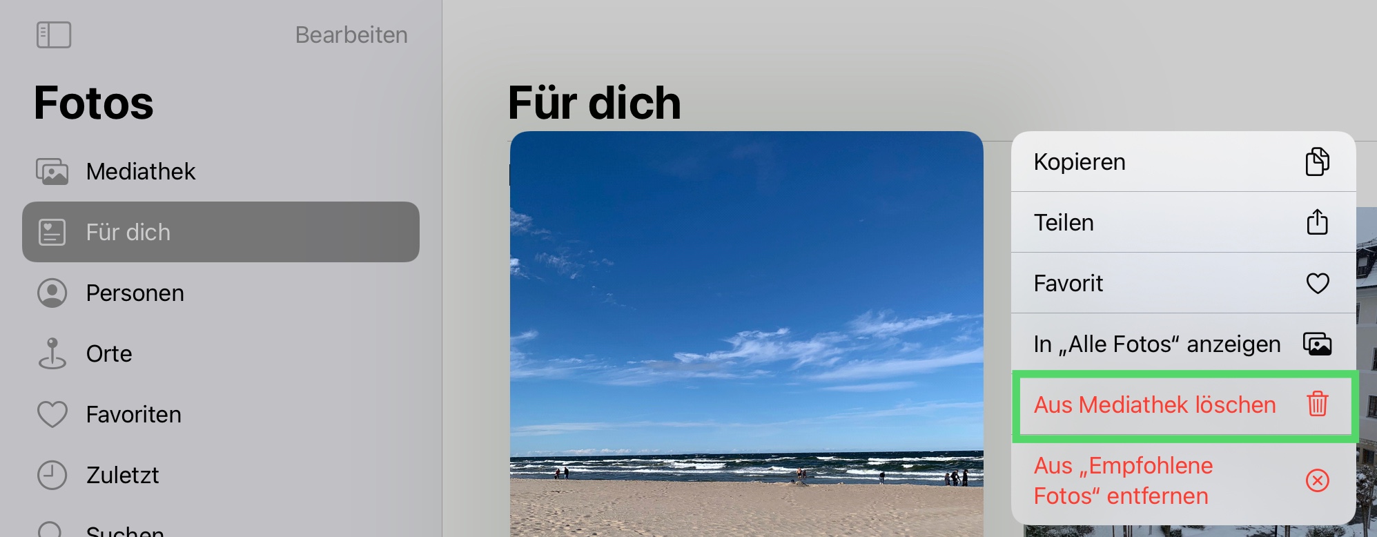 wie kann ich auf dem iPAD Dateien im Ordner Fuer Dich bei FOTOS loeschen? Loeschen, nicht anderswohin speichern!
