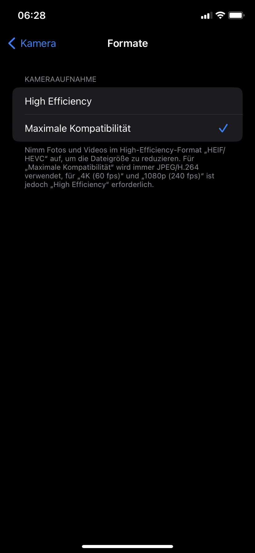 Mein iPhone ist auf iOS 16 upgedatet und die Kamera ist auf maximale Kompatibilität gesetzt.