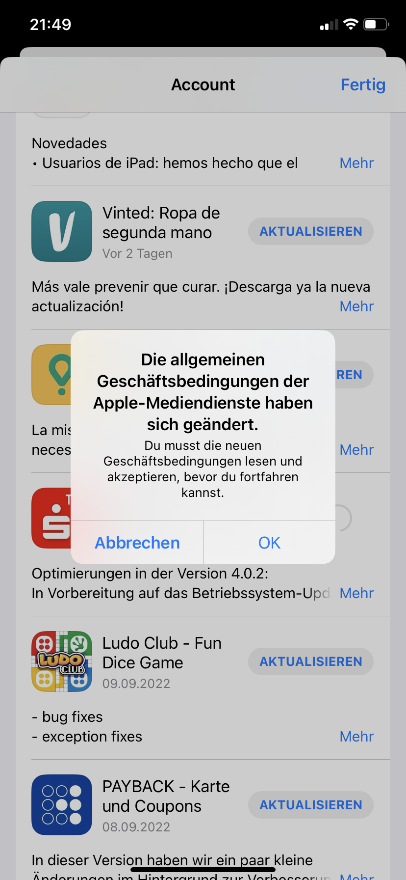 Hallo, ich kann die AGB der Apple-Mediendienste nicht akzeptieren. Wenn ich auf „ok“ klicke öffnen sich die AGB, ich akzeptiere und das gleiche Fenster wie auf dem Foto öffnet sich wieder.