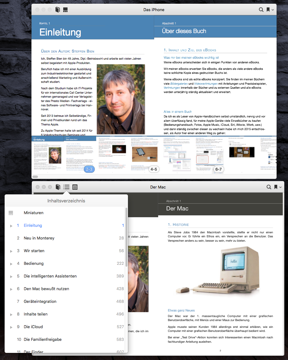 Ich habe das bei mir eben erneut ausprobiert. In einem Buch auf dem Mac erhalte ich die gleiche Ansicht wie du bei dem Buch "Das iPhone". Ich kann hierbei nach rechts wischen, um die Übersicht vom zweiten Kapitel und so weiter anzuschauen.