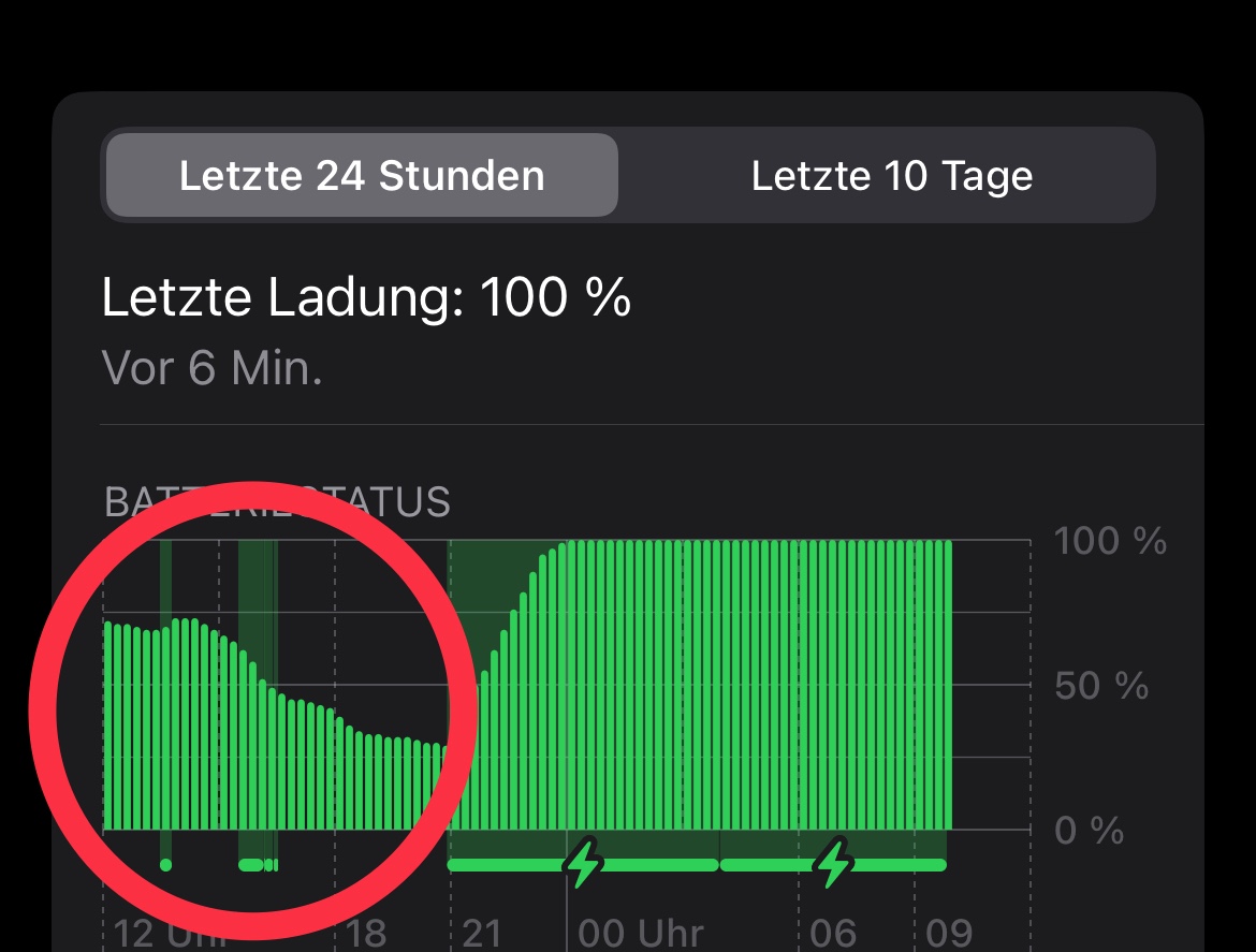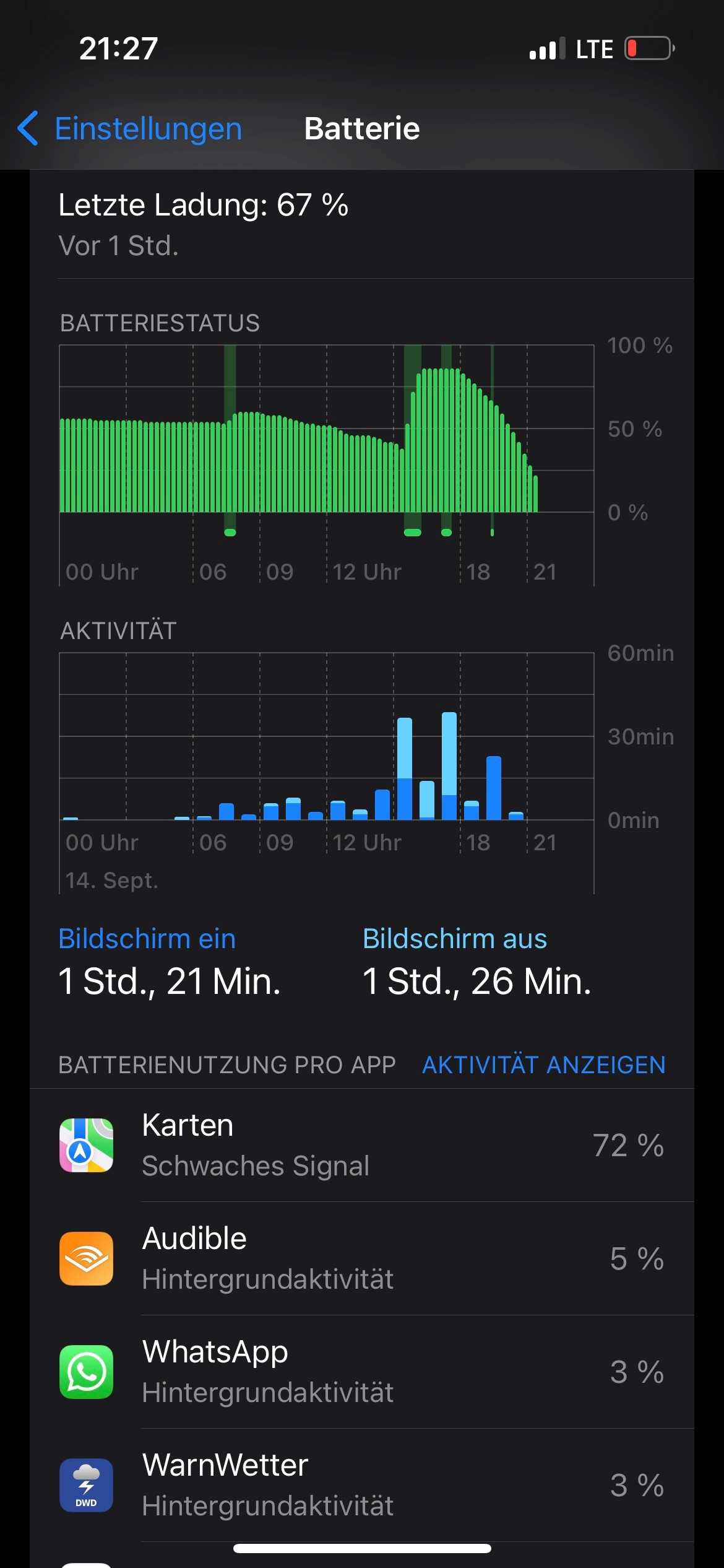 Im Menü "Batterie" ist die Akkunutzung nach kurzer Zeit mit Apple Karten an erster Stelle aufgeführt, mit dem Vermerk "schwaches Signal". Die angegebene Batterienutzung durch Apple Karten wird nach kurzer Zeit mit einem deutlich zweistelligen Prozentsatz gezeigt. Das iPhone erwärmt sich nach kurzer Zeit sehr stark, der Ladestand der Batterie schwindet dazu binnen Minuten (ca. 30-45 min) von ca. 85% auf 20% und das trotz Batteriezustand von 100%!