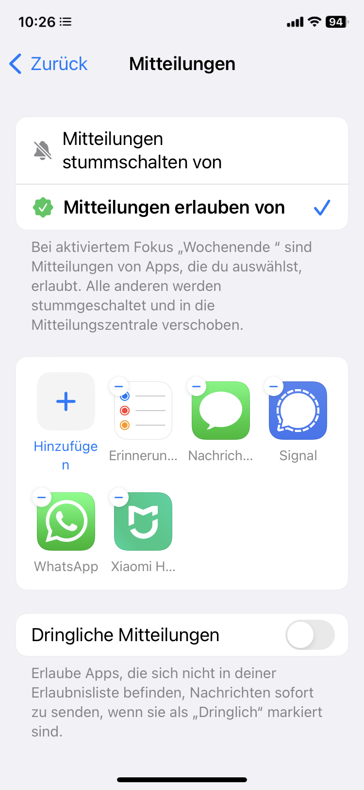 unter iOS 16 habe ich den Fokus "Wochenende" eingerichtet. WhatsApp Business z.B. ist NICHT in der Lister der Apps die mir Benachrichtigungen schicken dürfen.