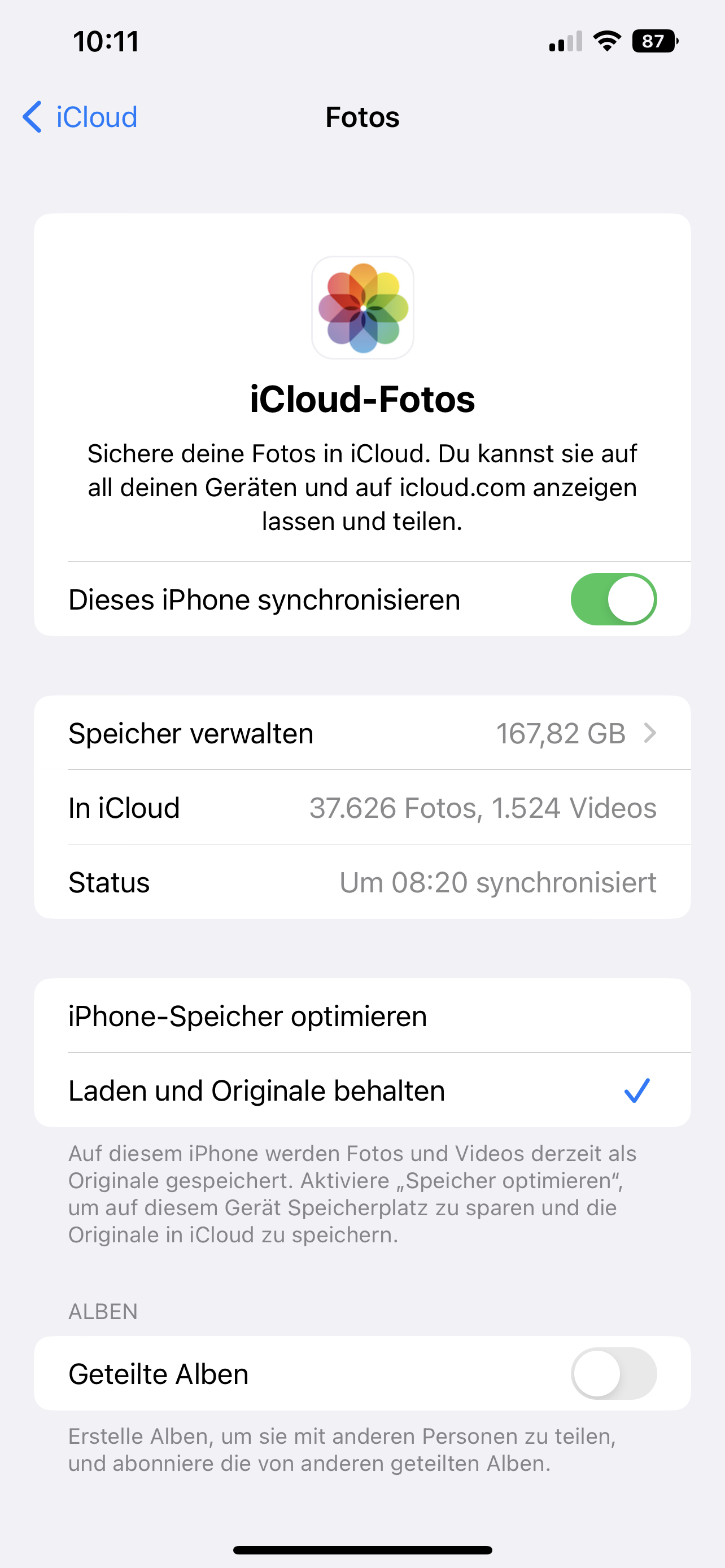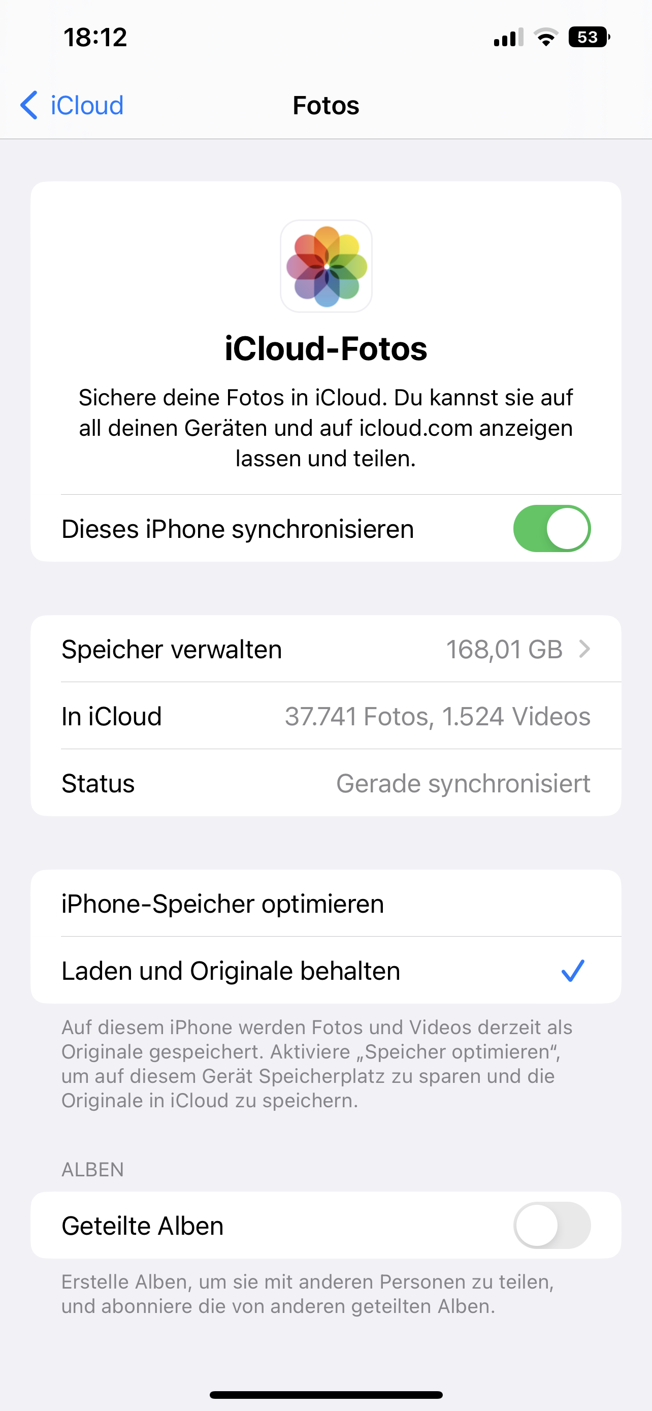 Ich habe bei meinem iPhone iCloud-Fotos mit „laden und originale behalten“ aktiviert und auch iCloud Back-up aktiviert. Mein Gerät (12 pro max) hat 256 GB Speicher. Ich möchte es nun für einen Akkuwechsel bei Apple einsenden. Dafür soll das Gerät zurückgesetzt werden. Bis ich es zurück erhalte, möchte ich ein älteres iPhone (6s) mit 128 GB Speicher nutzen und die Daten meines aktuellen Geräts darauf übertragen. 168 GB Fotos passen da aber natürlich nicht drauf. Wie kann ich sichergehen, dass die Fotos in der iCloud gesichert bleiben, bis ich mein reguläres iPhone zurück habe, wo ich sie wieder drauf laden kann. Hinweis: Ich könnte in der Übergangszeit natürlich auf die Fotos verzichten. In dem Zusammenhang ist mir auch aufgefallen, dass in iCloud 168 GB Fotos gespeichert sind, auf dem Gerät aber 189 GB. Wie kann das sein? Es ist nur dieses eine iPhone mit dem Account synchronisiert.