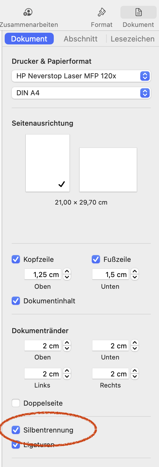 Genau das gemacht nur reagiert das Dokument nicht, auch bei "Einstellungen" ist Silbentrennung aktiviert.