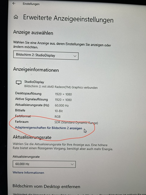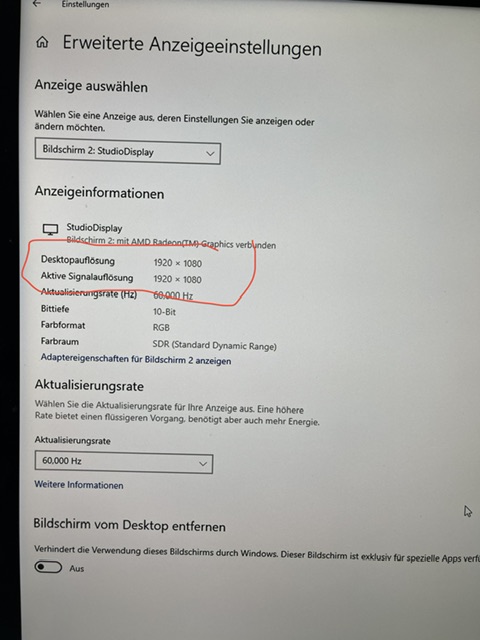 Ich habe das gleiche Problem mit dem Anschluss meines Arbeitslaptops mit meinem privaten Studio Display gehabt: Studio Display wurde als 2. Bildschirm erkannt, auch die Kamera in Teams funktioniert, aber kein Bild auf dem Studio Display: nur Flackern. Habe verschiedene Kabel probiert - es hat nichts funktioniert. Gestern habe ich es aber hingekriegt: ganz einfach mit dem mitgelieferten Apple Thunderbolt-Kabel ans USB-C Port des Laptops angeschlossen und in den erweiterten Anzeigeeinstellungen unter Grafikkarte einen Modus unter 5K ausgewählt. Wichtig: auch wenn Studio Display bei der Auswahl immer noch nicht anspringt, auf Übernehmen drücken. Dann klappt es auf einmal. Es funktioniert nur bei „Anzeige erweitern“. „Speiegln“ oder „Nur auf 2 anzeigen“ funktioniert nicht. Aber ich kann den Laptop zuklappen und Studio Display bleibt an. Das reicht mir aus. Ich hoffe es hilft!