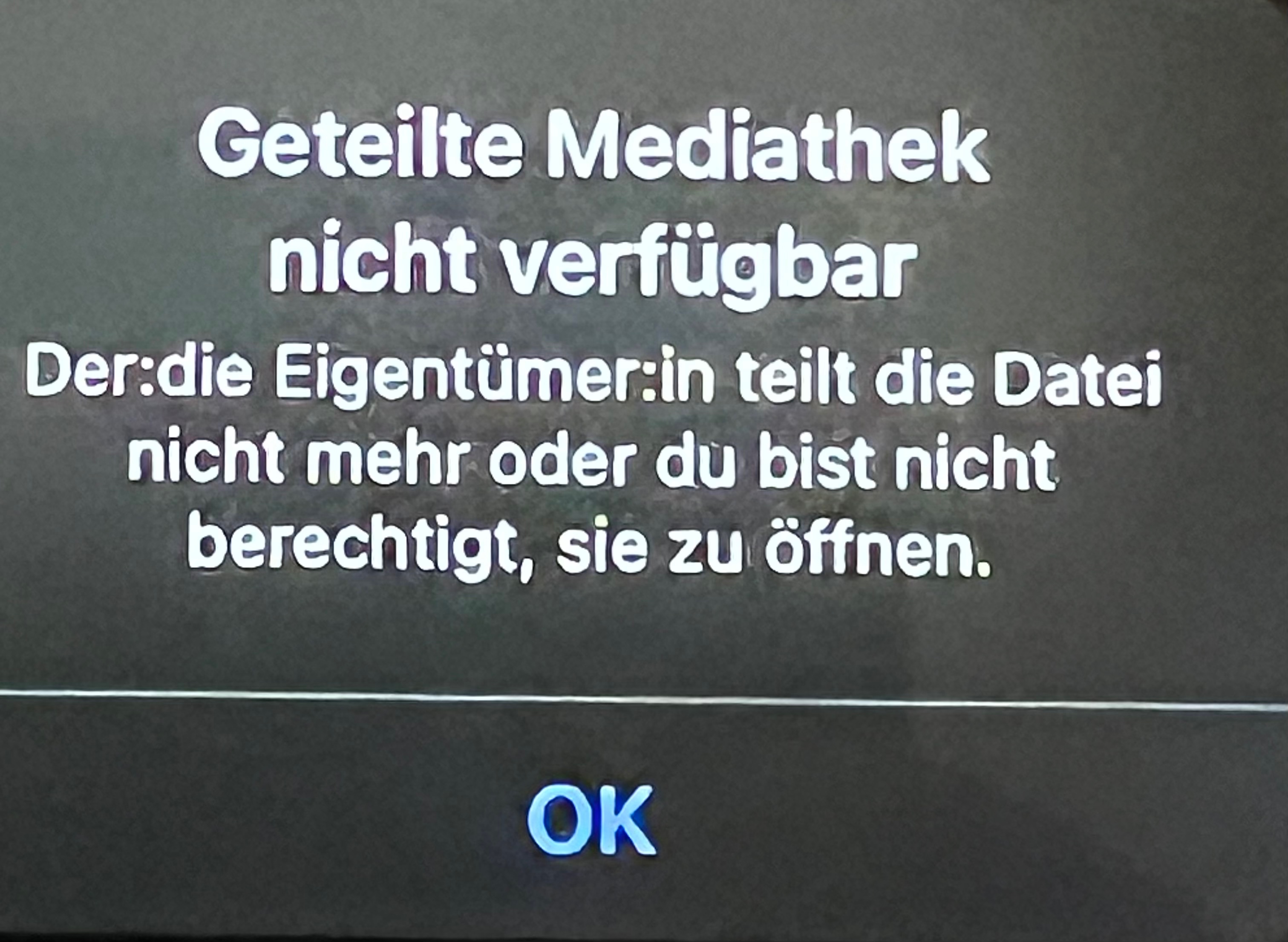 Num nachdem alle Fotos in die geteilte Mediathek verschoben worden sind, kriege ich jedes Mal die gleiche Fehlermeldung auf dem iPhone meiner Frau. Auch bei einem anderen Teilnehmer bei uns zuhause das gleiche Verhalten (Fehlermeldung).
