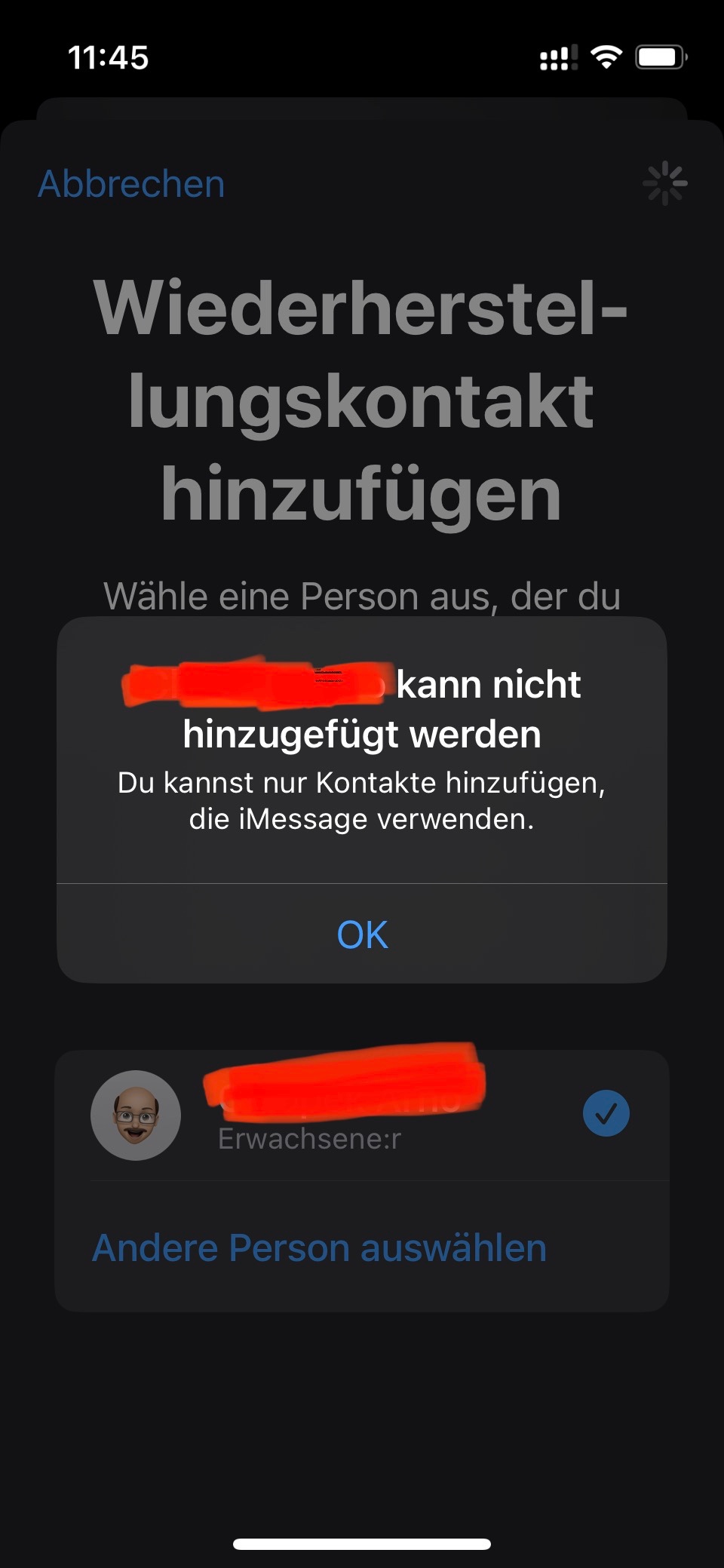 Leider bekomme ich die Fehlermeldung wie oben: Der Kontakt kann nicht hinzugefügt werden da er kein iMessage nutzt.