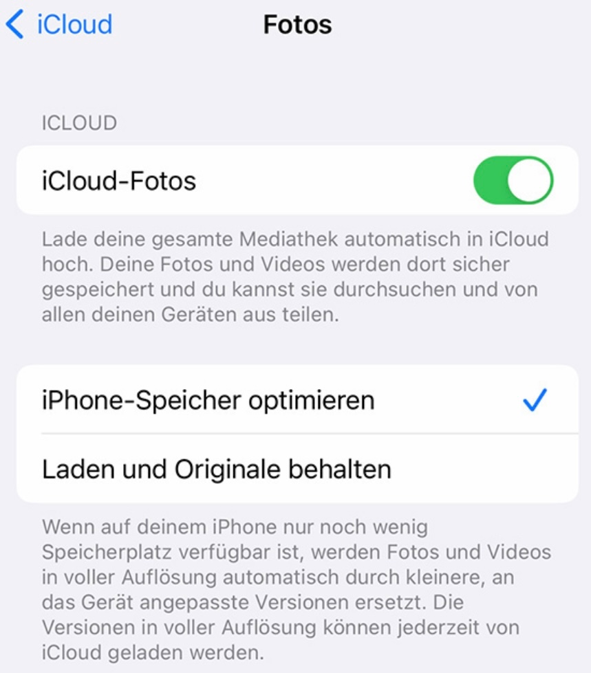 Typischerweise wird seit einigen Jahren iCloud Fotos automatisch als Voreinstellung aktiviert, und noch dazu mit "Optimiere iPhone >Speicher" aktiviert, sofern man zusätzlichen Cloud Speicher abonniert hat. Apple geht wohl dann aus, dass man zusätzlichen iCloud Speicher vor allem dazu abonniert, um grosse Mediendateien in iCloud anstelle auf den Geräten unterzubringen. Du bist nicht der erste, der davon überrascht worden ist.