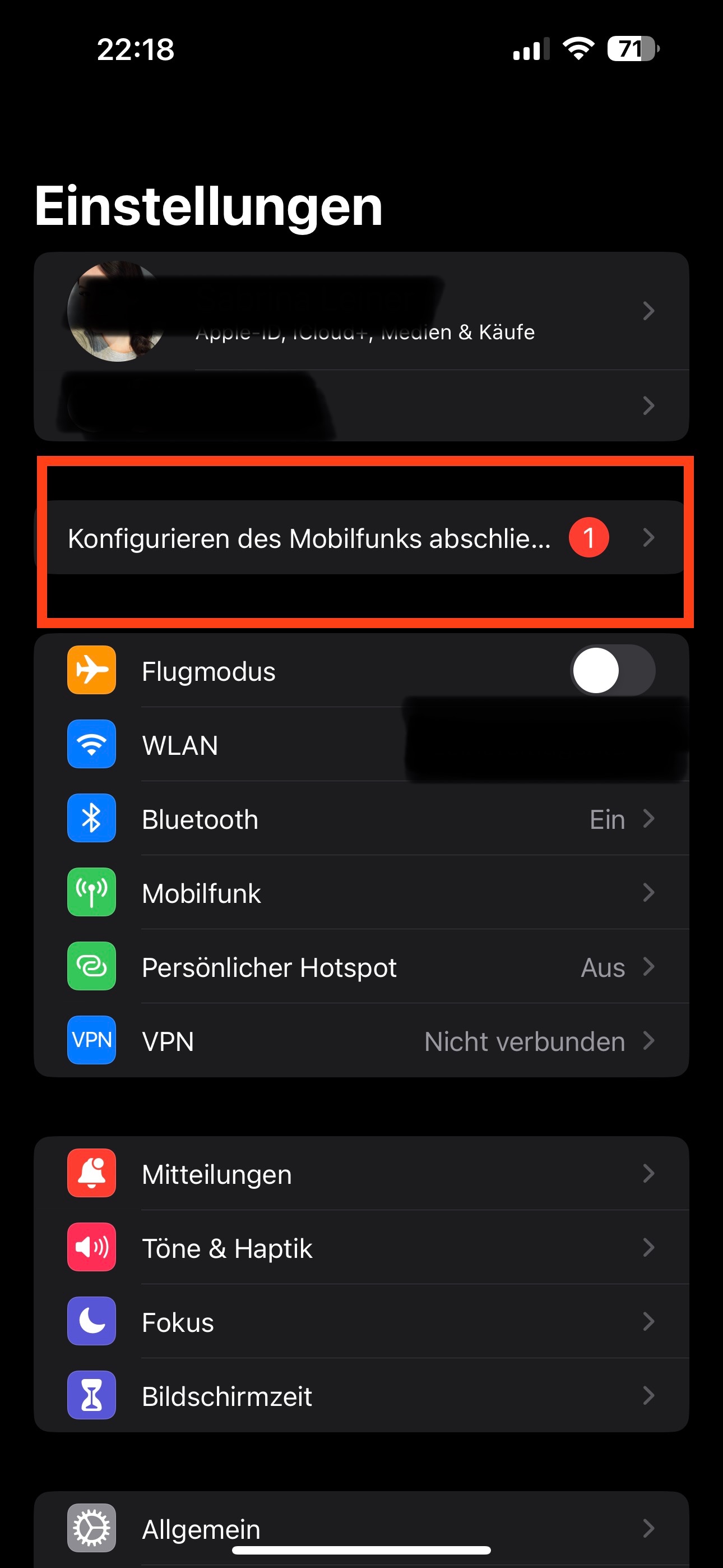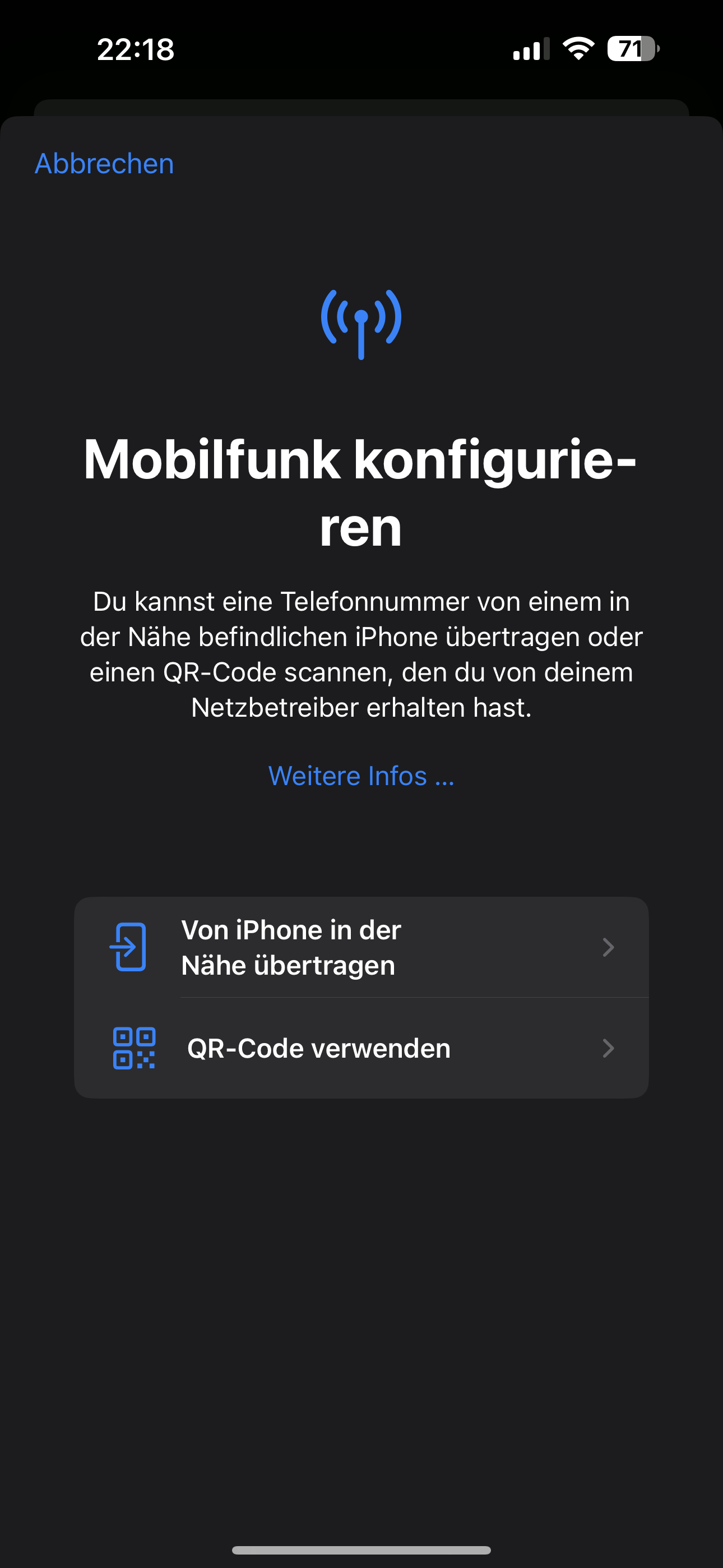 ich kriege permanent eine Meldung in den Einstellungen, dass ich meine Konfiguration für den Mobilfunk abschließen soll. Klicke ich darauf kann ich die Nummer nur von einem anderen Handy übertragen oder den QR Code einscannen. Die physische SIM Karte ist jedoch bereits eingelegt, funktioniert auch problemlos.