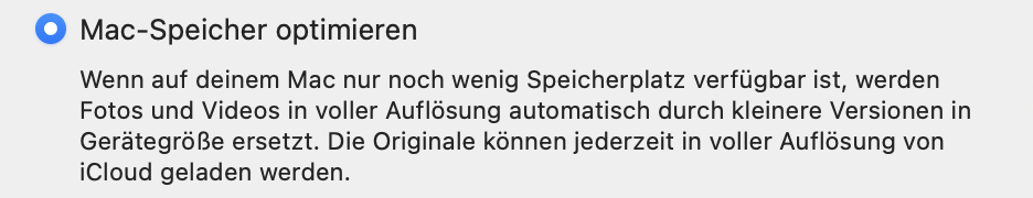 Ich habe meine Fotos in iCloud. Auf meinem MacBook Air habe ich jetzt ein Speicherproblem. Obwohl ich in den Einstellungen "meinen Speicher optimieren" (sowohl in Fotos als auch in iCloud) eingestellt habe verbraucht Fotos noch immer ⅔ des gesamtem Speichers. Kann ich das irgendwie beschränken oder Fotos anders konfigurieren?