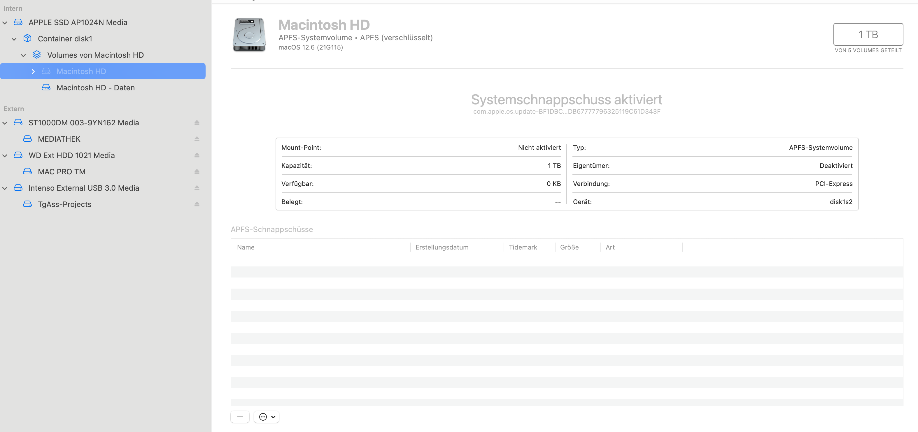 bei mount-point steht "nicht aktiviert" und dass ein Systemschnappschuss aktiv sei, den ich mir eine ebene drunter auch anschauen kann. der hat ca. 15 GB (macOS wahrscheinlich).
