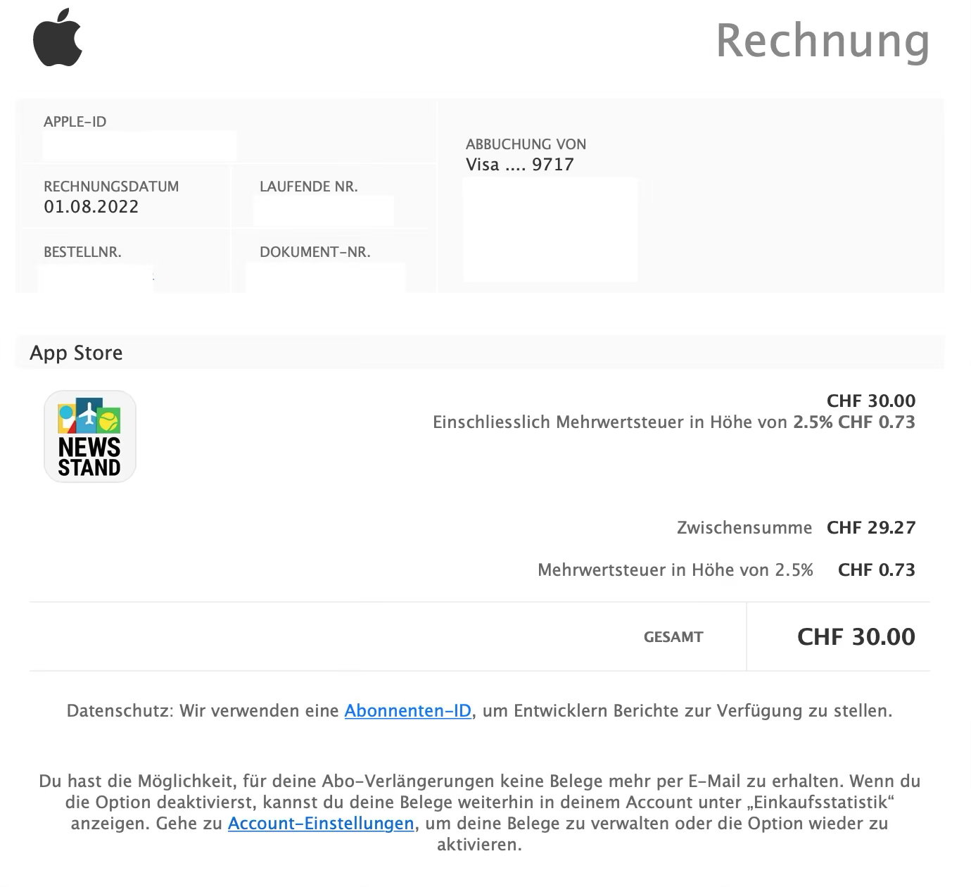 Ich habe ein Magazin Abo über United Kiosk gekauft aber den Zugriff nicht erhalten. Laut United Kiosk haben sie das Magazin nicht mehr im Angebot. Ich soll den Betrag bei Apple zurückfordern. Leider ist das nicht möglich. Wie soll ich vorgehen?