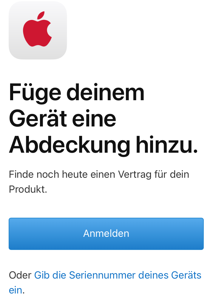 1. Gehe auf https://mysupport.apple.com/add-coverage?productTypeId=SG003 und melde dich mit deiner Apple-ID an oder wähle die Option Gib die Seriennummer deines Gerätes ein. (Wo du die findest, siehe Schritt 2.)