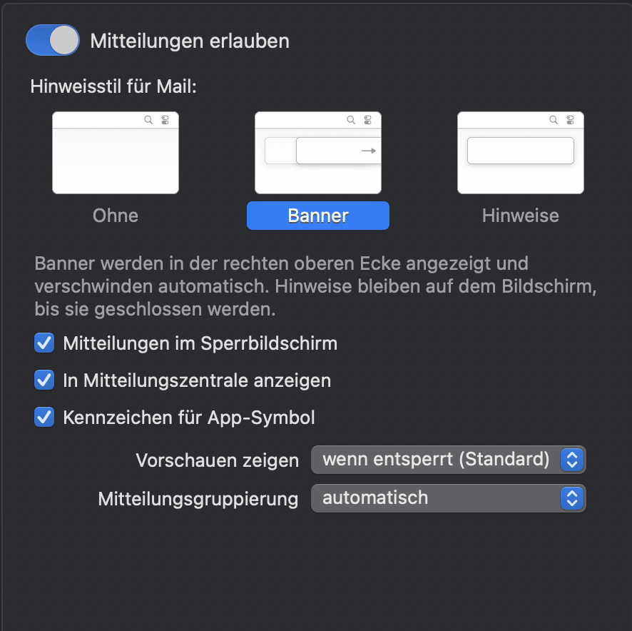 Hier sollte der Butten neben "Mitteilungen erlauben" aktiviert sein. Bei den in blau dargestellten Displays kannst du zwischen Startbildschirm, Mitteilungen oder Banner wählen. Du kannst auch alle drei aktivieren (Haken unter den jeweiligen Bereichen.