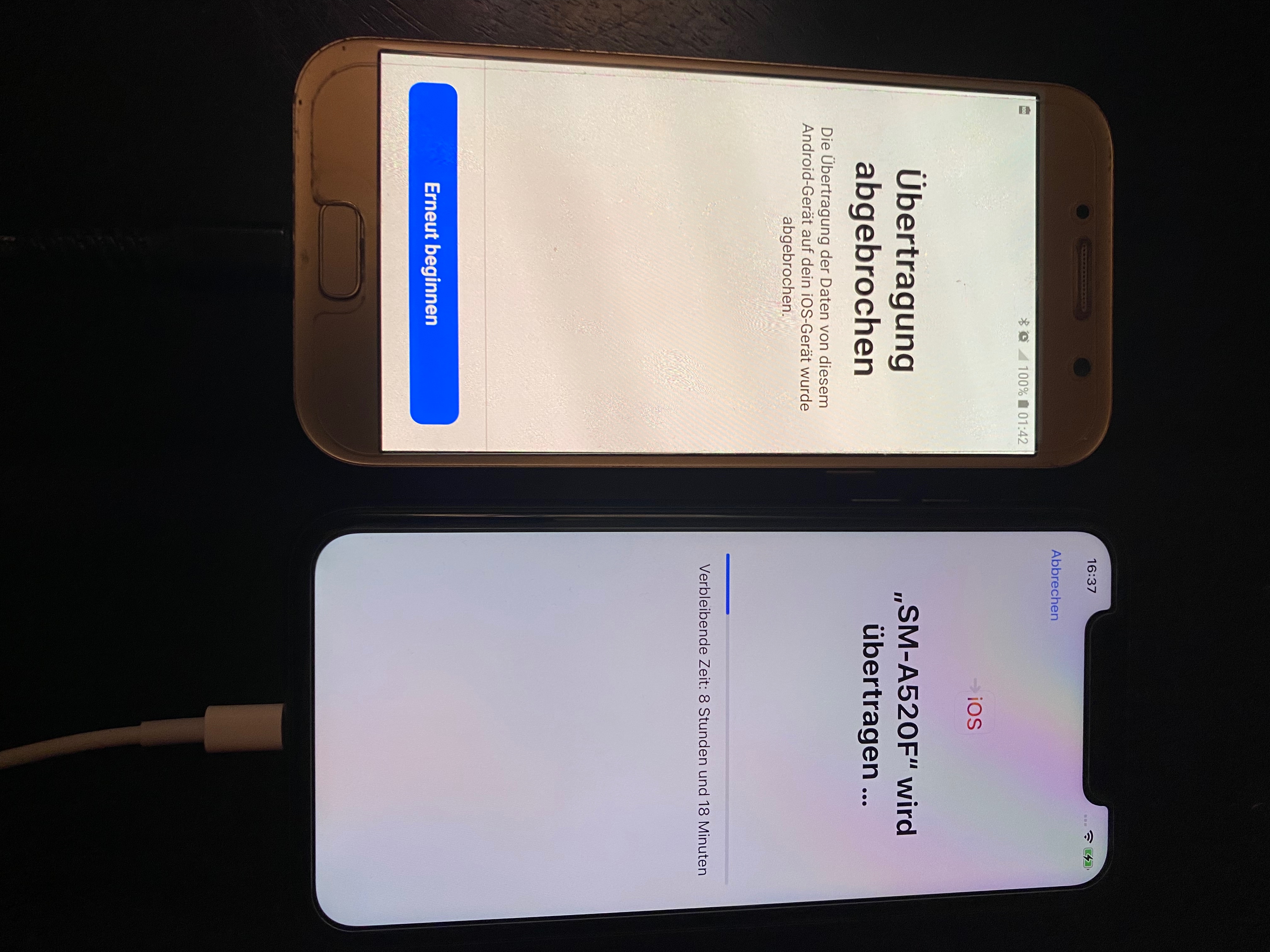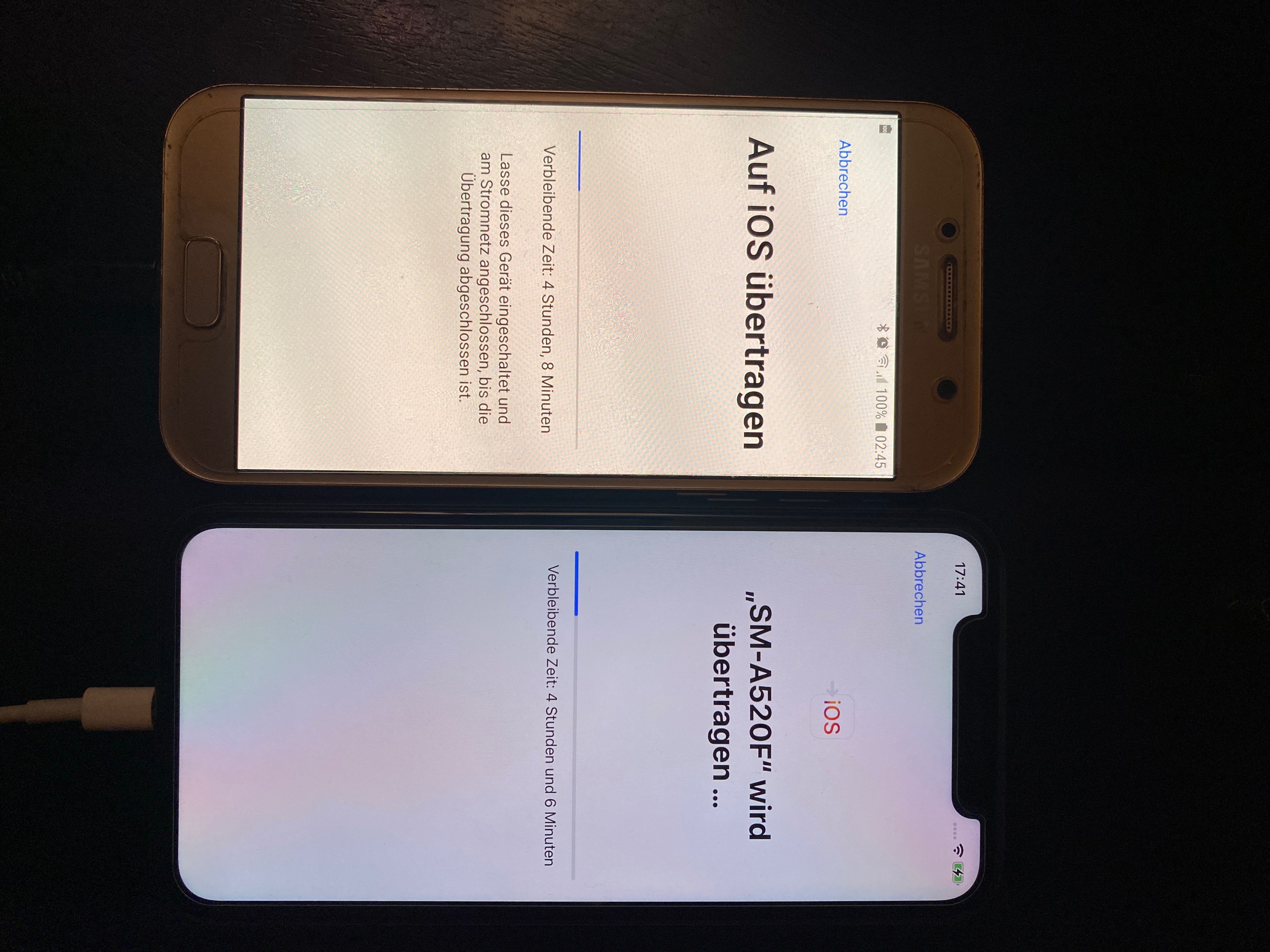 Ich habe es gestern mit einem Samsung Galaxy A5 (2017) auf iPhone 11 probiert. 10 Std. und 5 x neu gestartet da jedesmal nach unterschiedlicher Zeit eine Meldung am Samsung erschien. „Übertragung unterbrochen“.