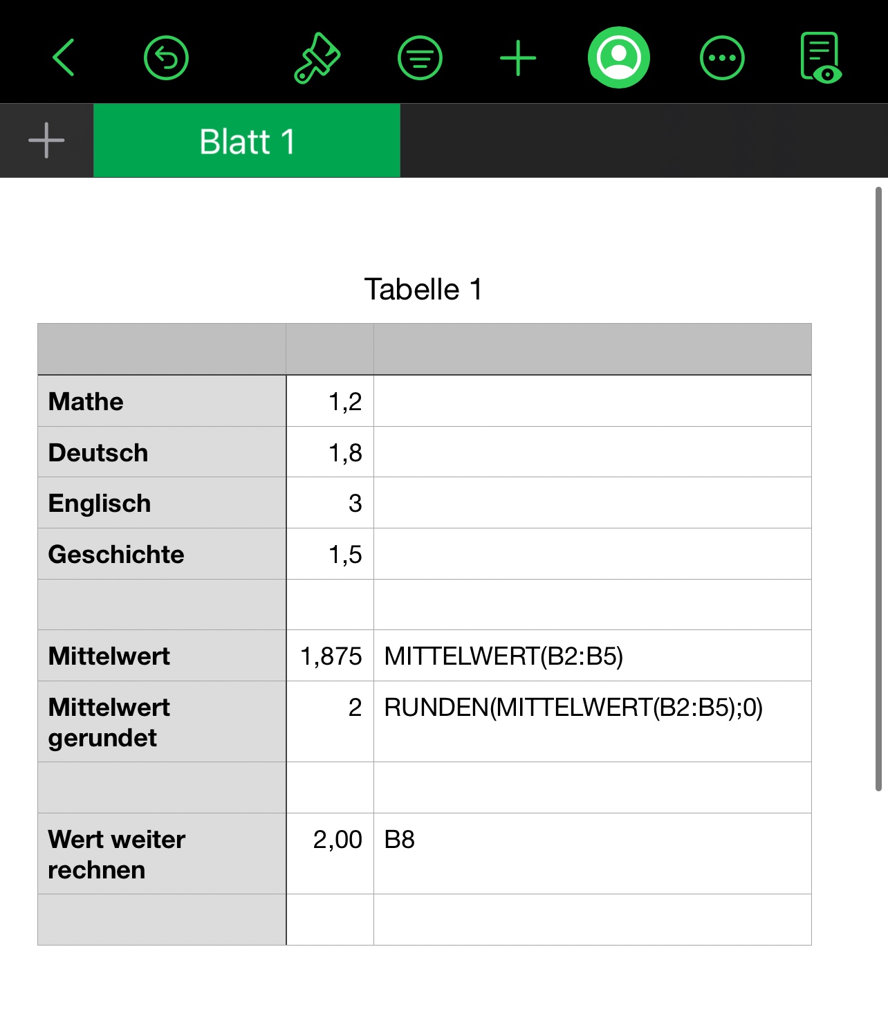 Ich erstelle ein Notenbuch für mich selbst und möchte gerne bei TÜ mehrere zusammenfassen und mit dieser zusammengefassten Note rechnen. Dazu muss ich den Mittelwert aller TÜ nehmen und als ganze Zahl mit in die Berechnung des Mittelwertes aller Noten einfließen lassen.